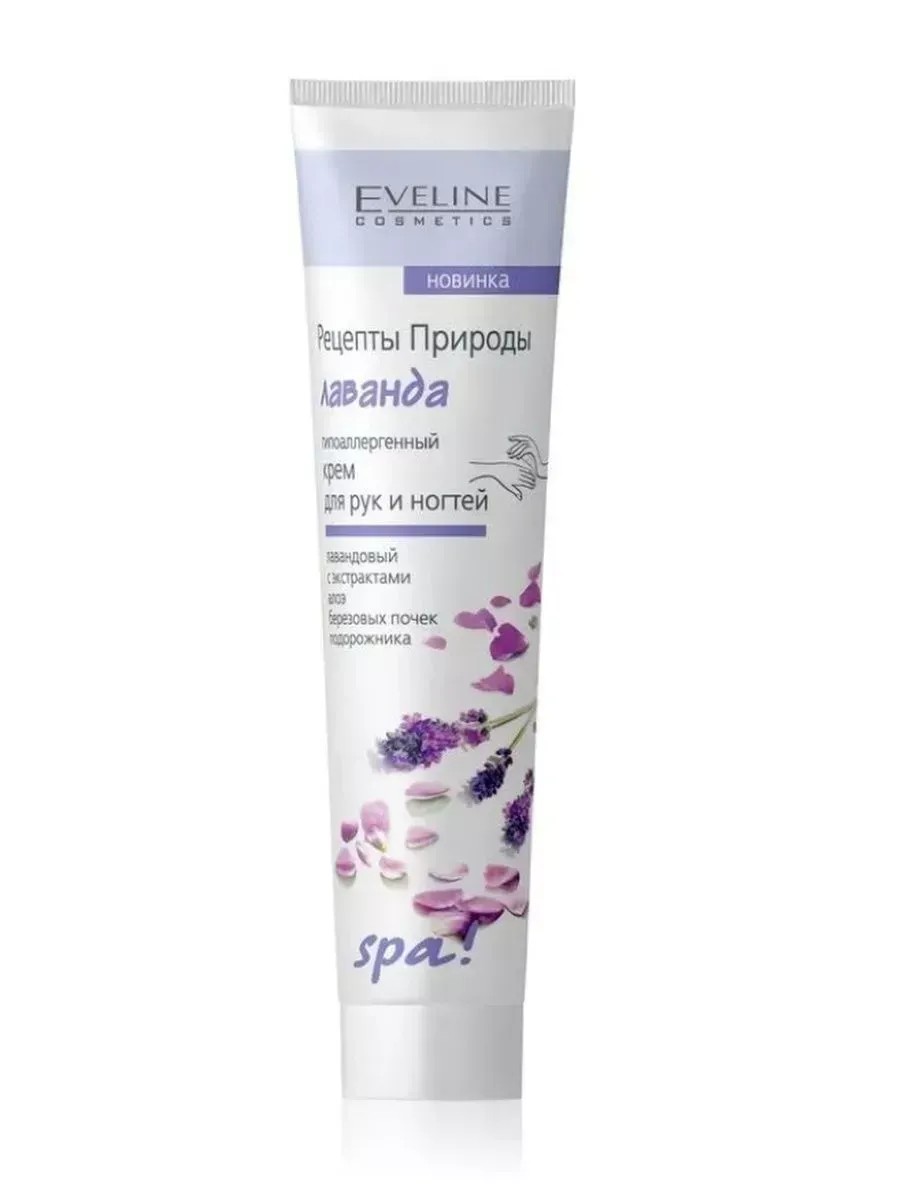 EVELINE Recipes of Nature SPA Lavender Hand Cream, 125 ml. Innovative hypoallergenic hand and nail cream. RECIPES OF NATURE SPA Lavender has an unusually soft, light consistency and a subtle lavender aroma. Designed for the care of dry and chapped skin of the hands. It forms a thin film on the skin's surface that protects it from the damaging effects of water, cold, and temperature changes. The condition of the skin on the hands improves after the first use. Lavender extract heals wounds and microdamage to the skin of the hands, perfectly smoothing it. Aloe vera perfectly tones, moisturizes, and refreshes the skin. Plantain eliminates inflammation and deeply nourishes. It has antiseptic and soothing properties. Birch buds are a rich source of vitamins and healing substances, giving the skin elasticity and firmness. The cream contains the NMF (Natural Moisturizing Factor) hydrocomplex, which promotes intensive skin hydration. Active ingredients in the moisturizing factor replenish moisture in the skin, leaving it silky soft and healthy-looking. A cocktail of vitamins A, E, F, and B5 actively suppresses free radicals, reduces moisture loss, and promotes nail strengthening and growth. The cream prevents splitting nails, softens cuticles, and facilitates their removal. The SPA formula provides the skin with superior relaxation and soothing effects.