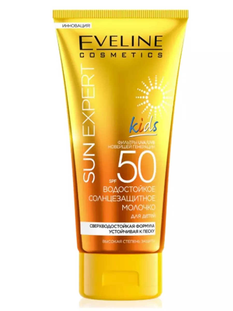 Eveline Sun Expert, Молочко Солнцезащитное Spf 50 для детей Водостойкое 150 мл. Максимальная защита от UVA/UVB лучей и от солнечных ожогов. Инновационное детское молочко c ультравысокой степенью защиты разработано специально для нежной кожи малышей с учетом их поведения на солнце, многочисленных купаний в море, игр на песчаных пляжах. Пленкообразующая текстура с богатым содержанием успокаивающих компонентов защищает от раздражающего воздействия соли, хлора и песка. UVA/UVB фильтры обеспечивают эффективную защиту от солнечных ожогов, не разрушаются под воздействием солнечной энергии и долго сохраняют свою высокую эффективность. Благодаря комплексу защитных компонентов молочко надежно охраняет нежную кожу ребенка. Поддерживает увлажнение верхних слоев эпидермиса и питает кожу. Средство гипоаллергенно, проверено дерматологически. Молочко для детей легко и удобно наносится, что позволяет равномерно распределить его по всему телу и лицу.