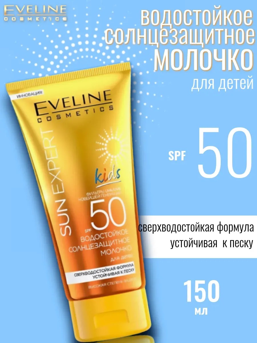 Eveline Sun Expert, Молочко Солнцезащитное Spf 50 для детей Водостойкое 150 мл. Максимальная защита от UVA/UVB лучей и от солнечных ожогов. Инновационное детское молочко c ультравысокой степенью защиты разработано специально для нежной кожи малышей с учетом их поведения на солнце, многочисленных купаний в море, игр на песчаных пляжах. Пленкообразующая текстура с богатым содержанием успокаивающих компонентов защищает от раздражающего воздействия соли, хлора и песка. UVA/UVB фильтры обеспечивают эффективную защиту от солнечных ожогов, не разрушаются под воздействием солнечной энергии и долго сохраняют свою высокую эффективность. Благодаря комплексу защитных компонентов молочко надежно охраняет нежную кожу ребенка. Поддерживает увлажнение верхних слоев эпидермиса и питает кожу. Средство гипоаллергенно, проверено дерматологически. Молочко для детей легко и удобно наносится, что позволяет равномерно распределить его по всему телу и лицу.Крем обладает легкой текстурой, что делает его идеальным вариантом для жирной кожи лица. Оно предотвращает пересушивание кожи и способствует ее увлажнению на протяжении всего дня.