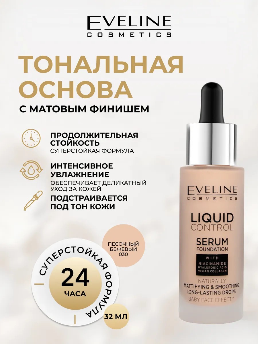 Тональная основа eveline liquid control – это средство декоративной косметики для макияжа, которое благодаря своей нежирной и исключительно легкой консистенции обеспечивает максимальную стойкость, идеально выравнивает тон, эффективно скрывает недостатки и длительно матирует до 24 часов без «эффекта маски». Придает естественное сияние и разглаживает рельеф кожи.