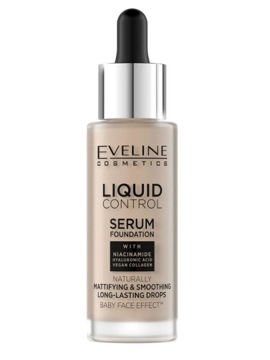 Eveline, Liquid Control Foundation, innovative liquid, shade 030 sand beige, 32 ml. This innovative new-generation foundation with a liquid, non-greasy, and very light texture provides the most natural "second skin" effect. It evens out skin tone and smooths skin with a "baby face" effect. The ultra-light formula, applied with a pipette, provides medium coverage and lasts up to 24 hours. The face looks flawless and natural. Easy to use, invisible, and imperceptible. Foundation plays a vital role in creating flawless makeup for the modern woman. To achieve a truly flawless result, a charming woman should invest in the revolutionary Liquid Control.