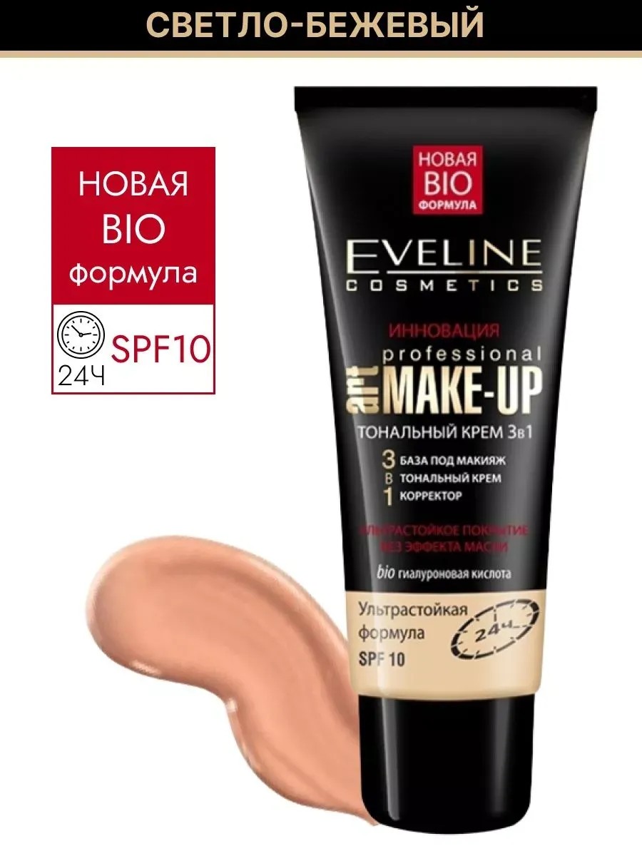 ART PROFESSIONAL MAKE - UP 3в1 - это новая bio формула 3в1 : База под макияж + Тональный крем + Корректор. Необыкновенная тающая текстура и усовершенствованная рецептура тональной основы, основанная на минеральных пигментах, обеспечивают потрясающий ультраестественный и мегастойкий макияж. Невесомая консистенция создает легкое бархатистое покрытие с натуральным финишем. Новая и проверенная формула раскрывает естественную красоту кожи, одновременно маскируя её несовершенства. Eveline Жидкий Тональный крем 3в1 ART Professional Make Up выравнивает цвет лица и скрывает недостатки кожи без эффекта маски, гарантируя безупречный макияж в течение дня. Тональный крем от Eveline (эвелайн) адаптируется к коже, придавая естественный и молодой вид. Формула Long Lasting 24ч обеспечивает исключительную стойкость и устойчивость к стиранию. Тональное средство обогащено гиалуроновой кислотой, которая интенсивно увлажняет и тонизирует кожу. Фильтр SPF 10 защищает от негативного воздействия солнечного излучения. Для увеличения стойкости макияжа можно использовать средство для выравнивания тона, как базу под макияж.