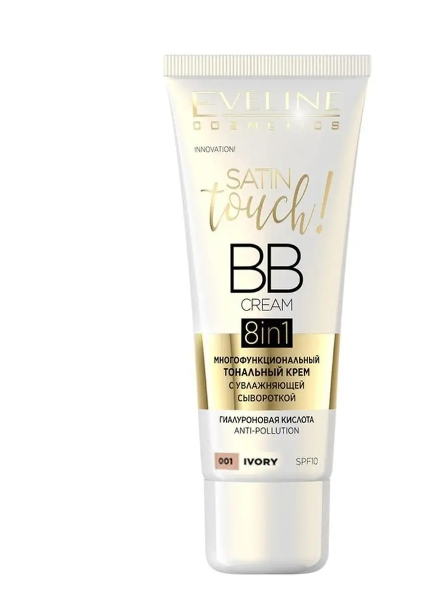Крем Eveline с увлажняющей сывороткой 001 ivory серии satin touch bb cream 8in1, 30 мл 1 шт. Многофункциональный тональный крем с увлажняющей сывороткой. Устраняет несовершенства, сокращает поры, заполняет морщинки. Обеспечивает длительное увлажнение, питает и тонизирует кожу, повышает эластичность и упругость, выравнивает рельеф лица, защищает от воздействия солнечных лучей и устраняет стянутость и сухость. Satin Touch BB Cream это уникальное и многофункциональное косметическое средство, которое работает как тональная основа и увлажняющий крем, Ваш макияж будет выглядеть идеально в течение всего дня. Инновационный комплекс Moist&Vital Complex и гиалуроновая кислота стимулируют производство коллагена и эластина, повышают эластичность и упругость кожи. SPF 10 обеспечивает защиту от солнца и предотвращает появление пигментации! Подходит для любого типа кожи, в том числе чувствительной, проблемной.