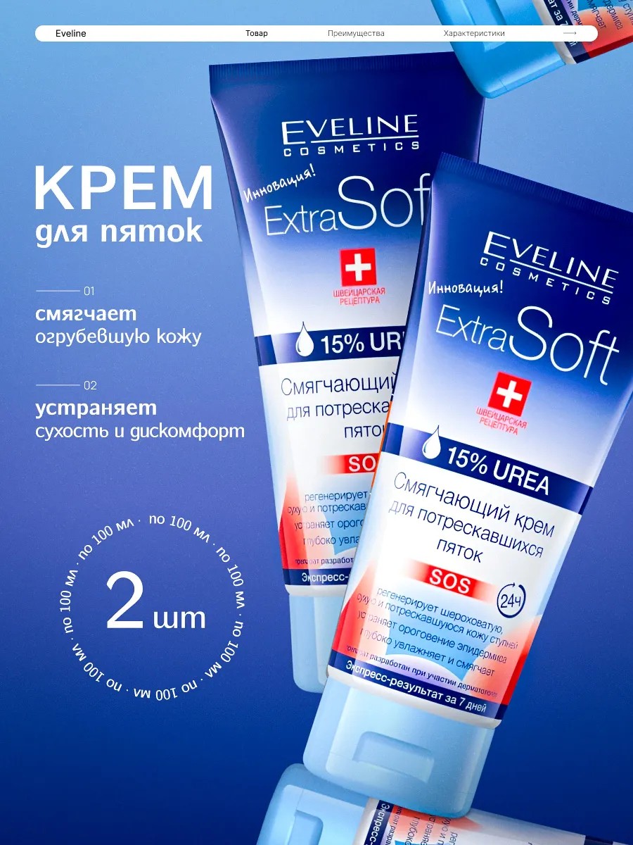 В наборе 2 крема по 100 мл. каждый. Смягчающий крем для потрескавшихся пяток Extra Soft от Eveline Cosmetics – это профессиональное средство для интенсивного ухода за очень сухой и поврежденной кожей стоп. Его инновационная формула, основанная на тщательно подобранных компонентах, уже в течении 7 дней заживляет трещины и устраняет ороговение на ступнях и пятках. 15-ти процентная мочевина в составе превосходно увлажняет, смягчает и ускоряет отшелушивание ороговевшей кожи. Натуральный бетаин повышает эластичность кожи. Масло ростков пшеницы увлажняет, снимает раздражение, разглаживает и придает упругость. Экстракт ромашки уменьшает раздражение и смягчает эпидермис, а камфора оказывает антибактериальное действие и ухаживает за кожей. Ментол обладает охлаждающим и освежающим действием, тонизирует и уменьшает шероховатость. Крем укрепляет структуру эпидермиса, предотвращая появление новых трещин и ороговелостей. Благодаря легкой текстуре он быстро впитывается, не оставляя жирной пленки. Идеально подходит для ежедневного использования, делая кожу стоп мягкой, эластичной и восстановленной. Способ применения: наносить крем 2 раза в день на чистые и сухие ступни, тщательно вмассировать. Не применять на открытые раны и инфицированную кожу ступней. После нанесения вымыть руки.