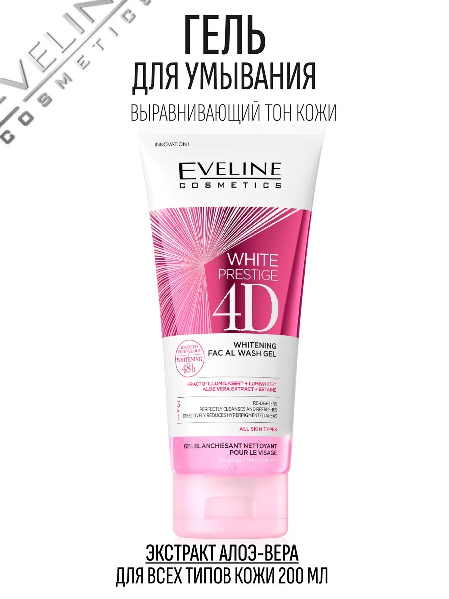 Отбеливающий гель для умывания лица Eveline White Prestige 4D — гель очищающий для лица, обогащенный комплексом LumiskinTM 4D White, регулирует синтез меланина, глубоко очищает кожу и способствует эффективному отбеливанию, делая кожу светлее с каждым днем. Умывашка дл лица с технологией FRACTO2 ILLUMI LASER с комплексом Lumiwhite, осветляет кожу, разглаживает и уменьшает пигментацию, как профессиональная лазерная процедура, проводимая в салоне красоты. Умывалка для лица разработан специально для ежедневного ритуала очищения кожи от внешних загрязнений и макияжа. Мягкая формула средства для умывания лица не оставляет ощущения сухости и подходит для всех типов кожи. Кожа чистая, выглядит здоровой и дышит свободно!