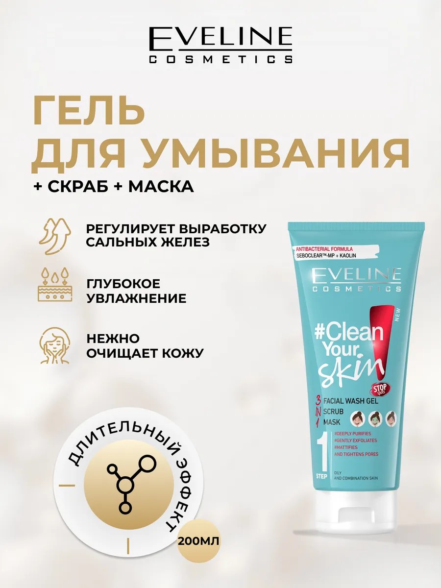 EVELINE Гель для умывания CLEAN YOUR SKIN +скраб+маска 3в1, 200 мл