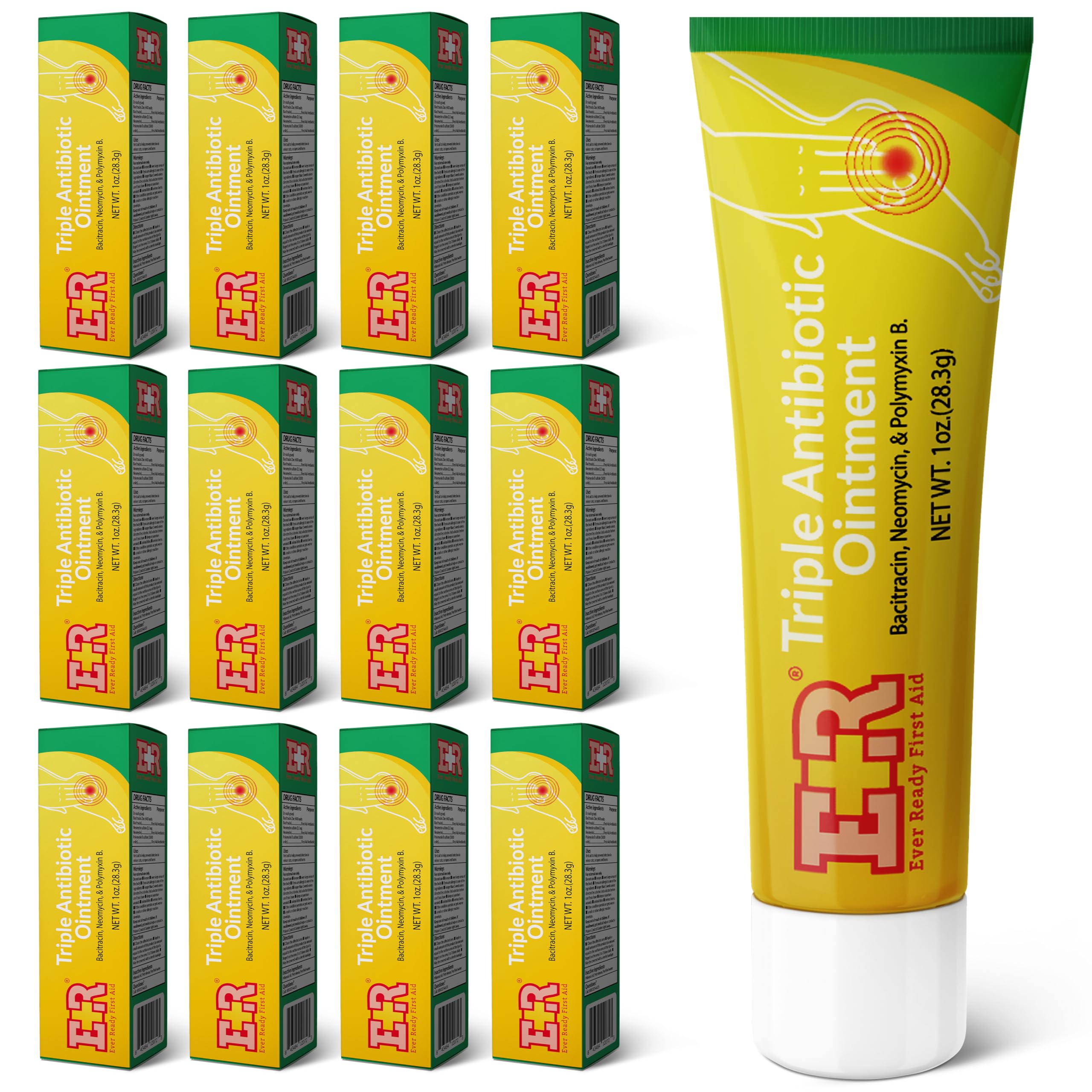 Convenient 12-Pack — Get more with our 12-pack of 1.0 oz. (28.3 g) tubes, perfect for keeping at home, in the car, or in your first aid kit, ensuring you're always prepared for any minor injury. Safety and Instructions Included — Each package comes with detailed usage instructions and safety warnings. For external use only avoid if allergic to ingredients, and do not apply in eyes or over large body areas. Equivalent to Top Brands — Rely on Ever Ready First Aid for quality that parallels the active ingredients of leading brands, ensuring dependable care and protection against infections. Contains Bacitracin Zinc — Specially formulated with Bacitracin Zinc to prevent infections and reduce the appearance of scars, helping your skin heal smoothly and more effectively. Effective Healing Support — Our antibiotic ointment aids in the rapid treatment of minor cuts, scrapes, and burns, ensuring long-lasting protection. Clean the area and apply a small amount 1-3 times daily, then secure with a bandage for best results.