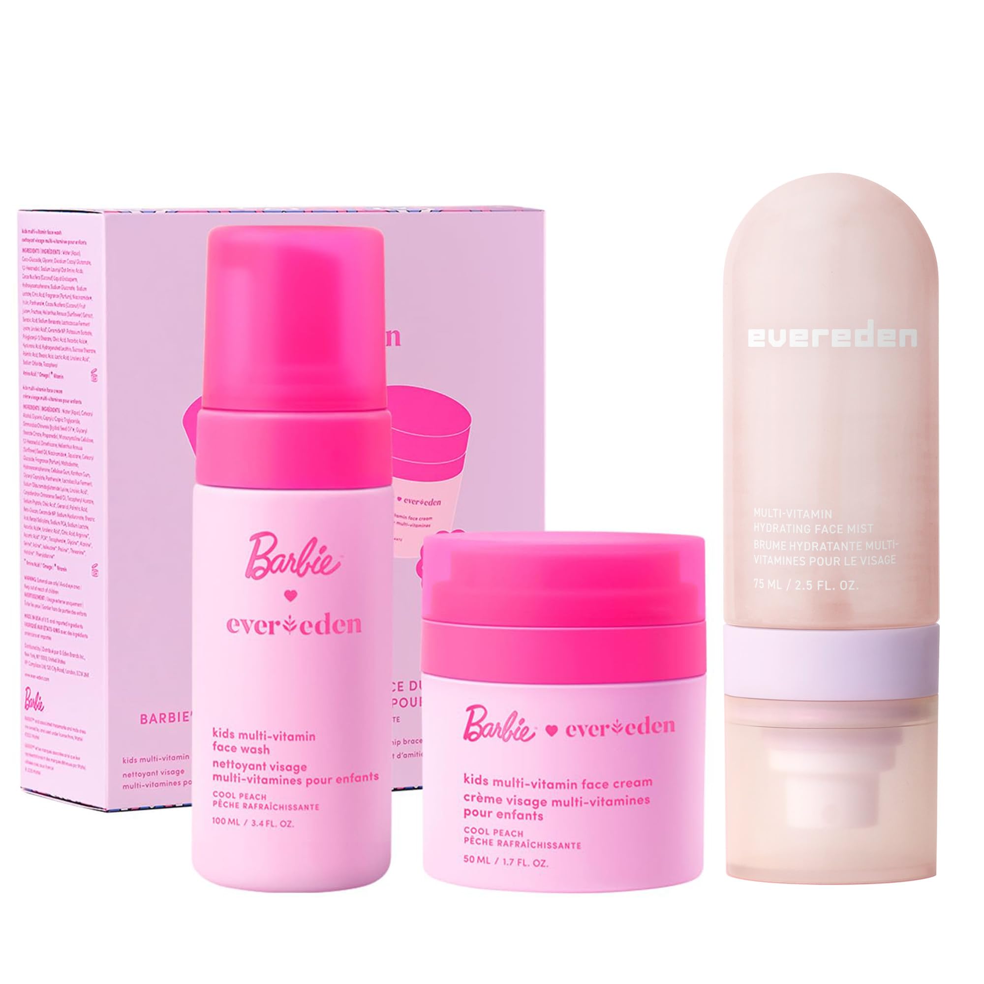 Evereden Happy Face DUO Barbie Edition & Multi-Vitamin Hydrating Mist Set: Multi-Vitamin Kids Face Wash & Cream Preppy Skincare Spray & Barbie Gift Bundle - Gentle Clean & Vegan