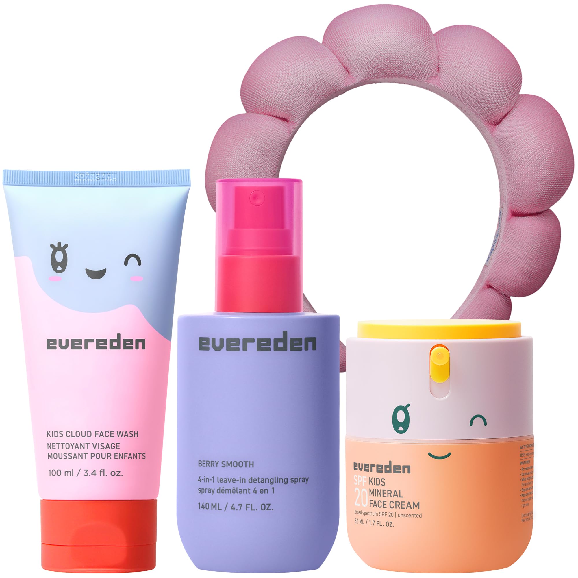 Evereden Kids Morning Skincare Set Cloud Face Wash SPF 20 Daily Face Cream Hair Spray & Headband 4-Piece Clean Routine Vegan & Dermatologist-Tested