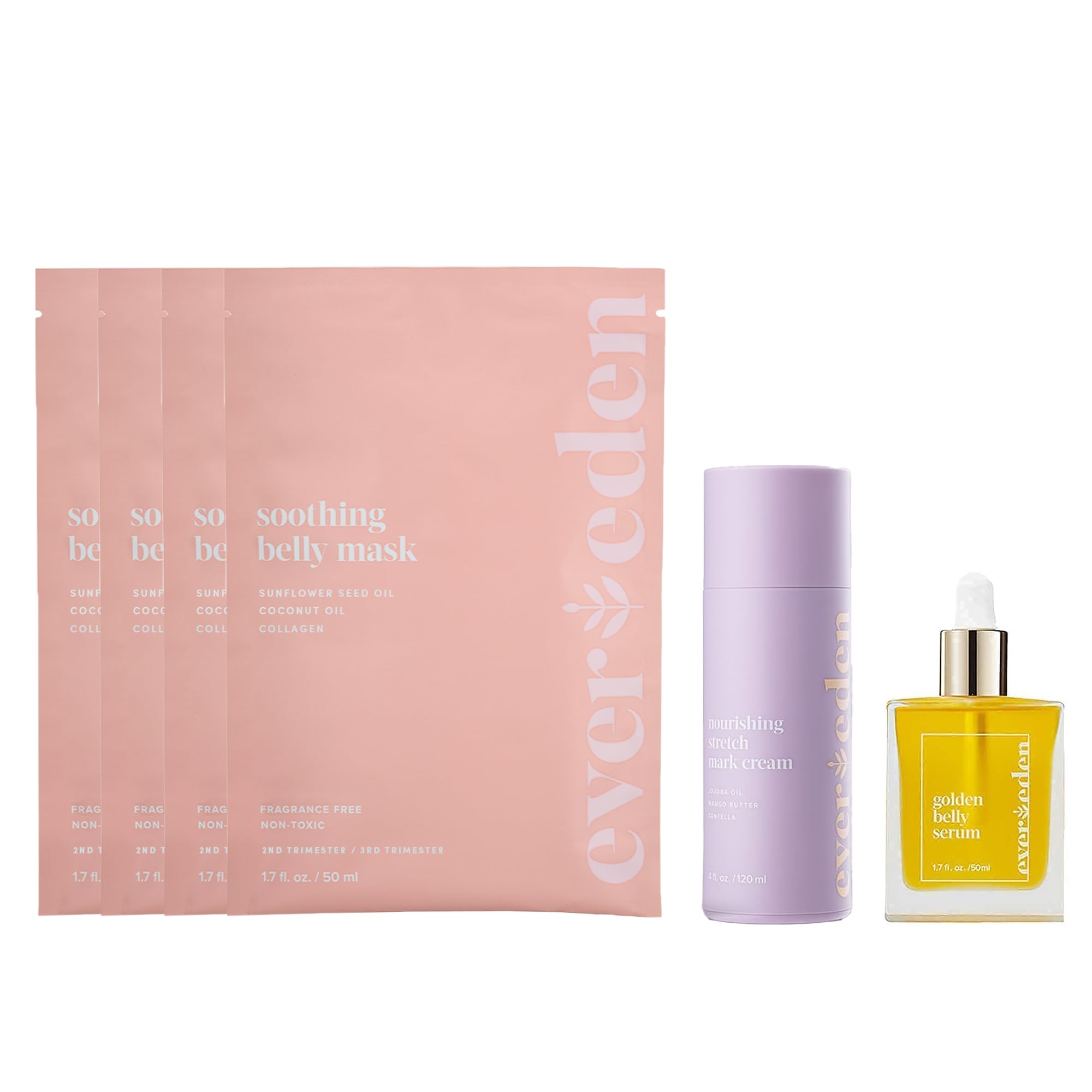 Evereden Nourishing Stretch Mark Cream 4.0 fl oz. & Golden Belly Serum 1.7 fl oz. & Soothing Belly Mask for Stretch Marks - 2nd/3rd Trimester Size 4 pack | 3 Item Bundle Set | Pregnancy Skincare