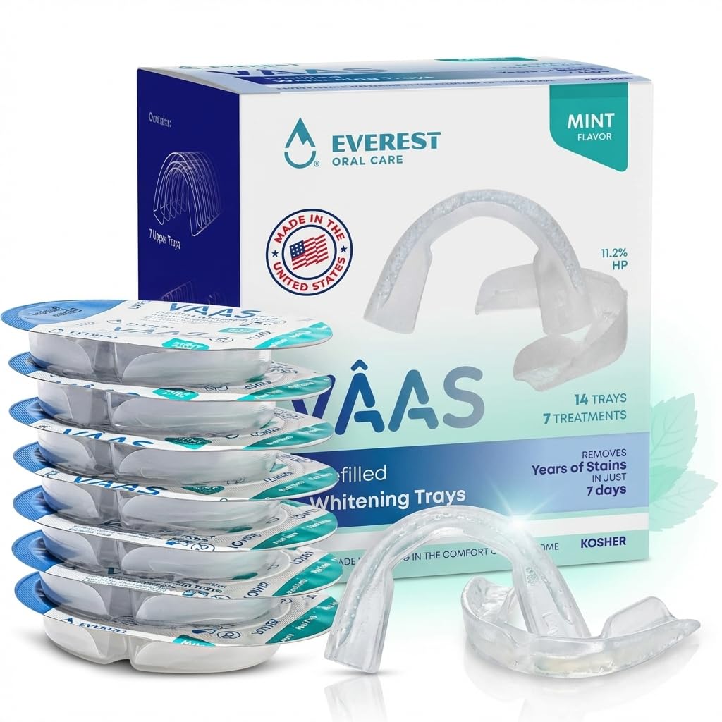 TRUSTED VAAS WHITENING QUALITY – Everest VAAS kosher-certified prefilled whitening trays are compact and travel-ready, offering professional-quality on-the-go or at-home teeth whitening. COMFORTABLE FOR SENSITIVE TEETH – Prefilled whitening trays are designed to fit securely and help protect enamel, offering a gentle teeth whitening option for sensitive teeth. DISPOSABLE, MESS-FREE WHITENING TRAYS – No syringes, loose gels, or lights required simply unwrap, apply, and toss for a quick, mess-free teeth whitening routine. FAST, NOTICEABLE RESULTS – Brightens your smile in just days many customers report visible results after 2–3 uses, with full whitening after one week. COMPLETE 7-DAY AT-HOME TEETH WHITENING KIT – Includes 14 prefilled teeth whitening trays for adults (7 upper 7 lower) with a refreshing mint flavor.