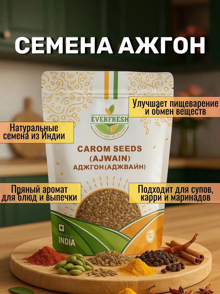 Ажгон семена (Carom Seeds), также известные как аджван или горный тмин - это пряность с насыщенным ароматом и ярко выраженным вкусом, напоминающим смесь тимьяна и аниса.