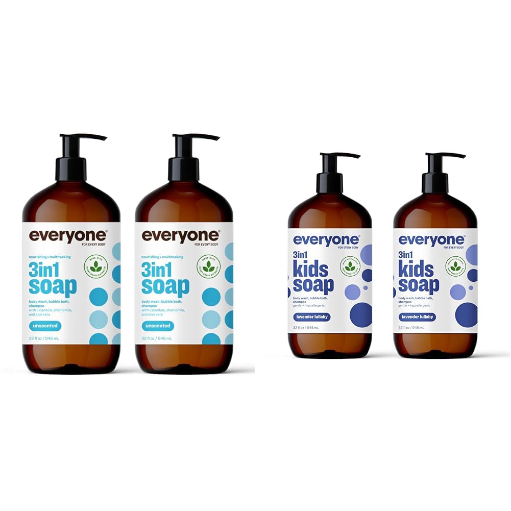 Everyone 3-in-1 Soap, Body Wash, Bubble Bath, Shampoo, 32 Fl Oz (Pack of 2), Unscented, Coconut Cleanser with Plant Extracts and Pure Essential Oils This is not your average soap. Everyone 3 in 1 Soaps combine gentle coconut cleansers, organic plant extracts, and vitamins E and B5 to nourish skin and hair while cleansing it of the day's dirt and impurities. We know life gets crazy, that's why our convenient 3-in-1 soaps work great as a shampoo, body wash, bubble bath, and even shave gel for a simplified routine. Plus, less bottles mean less plastic. At EO Products, we believe the best resources come from nature. That is why we are committed to our zero-waste mission. Our products are always made with reduction and repurposing in mind, this includes our recyclable packaging. Since 1995, we've made our products from domestic and imported ingredients in our family-owned and -operated factory in San Rafael, California. We learned early on that the only way to meet our own high standards was to take responsibility for everything ourselves. From our family to yours, enjoy. Everyone 3-in-1 Kids Soap, Body Wash, Bubble Bath, Shampoo, 32 Ounce (Pack of 2), Lavender Lullaby, Coconut Cleanser with Plant Extracts and Pure Essential Oils Bathtime just got a whole lot easier. Everyone 3 in 1 Kids Soap is formulated to be used as shampoo, body wash, and bubble bath. "Gentle" is our starting point. Combining soothing herbs like calendula, aloe vera, and chamomile with the antioxidants of white tea extracts and vitamins E and B5, your kids' hair and skin will feel nourished and clean. Just what nature intended. From head to tippy toes, this wonderful soap will leave your kid clean and happy. At EO Products, we believe the best resources come from nature. That is why we are committed to our zero-waste mission. Our products are always made with reduction and repurposing in mind, this includes our recyclable packaging. Since 1995, we've made our products from domestic and imported ingredients in our family-owned and -operated factory in San Rafael, California. We learned early on that the only way to meet our own high standards was to take responsibility for everything ourselves. From our family to yours, enjoy.Product 2: Scent: Everyone 3in1 Kids Lavender Lullaby Soap creates a sense of zen. Lavender pure essential oil brings on the zen while a hint of uplifting orange brightens the mood. Your kids will forget bathing is on the to-do list. Product 2: Contains: (2) 32 Ounce 100 Recycled Plastic Bottles of Everyone 3in1 Lavender Lullaby Kids Soap. For a limited time, you may receive either bottle while we update our packaging. New Look, Same Great Product. Product 1: Clean Promise: Everyone 3in1 Soap is EWG verified, GMO free, cruelty free, gluten free, triclosan free, and synthetic fragrance free. Product 1: Use: Our 3in1 Soap is a powerful do-it-all cleanser that will give you a refresh from head to toe. This unscented soap is free and clear of any essential oils, fragrances, or aromatic irritants so that you don't need to smell your soap in order to know it's working. Product 1: Everyone unscented soap provides a gentle but effective clean without leaving an aromatic trace. Product 1: Contains: (2) 32 Ounce 100 Recycled Plastic Bottles of Everyone 3in1 Unscented Soap.