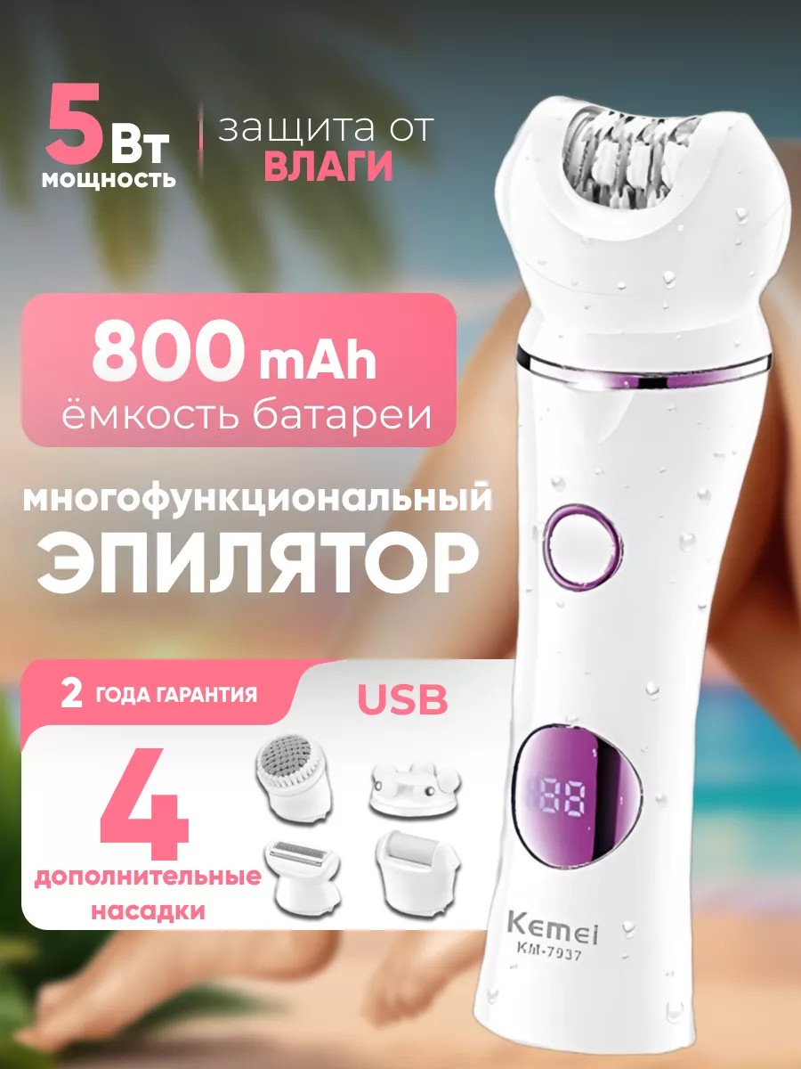 Эпилятор женский 5 в 1 Km 7937 Kemei. Электробритва поставляется с пятью различными насадками, предназначенными для различных задач. Вы можете эпилировать, брить, чистить лицо, массировать кожу и удалять мозоли и костные наросты. Это позволяет достичь полного ухода за кожей в домашних условиях. Головка эпилятора оснащена 40 парами пинцетов, что обеспечивает более эффективное и быстрое удаление волосков. Вы сможете получить гладкую кожу на длительное время без необходимости постоянного удаления волос. Размер депилятора делает его удобным в использовании и хранении.Электрическая бритва работает от литиевой батареи которая обеспечивает длительное время работы без необходимости постоянной замены батарей. Вы сможете использовать электро бритву в течение 60 минут после полной зарядки, которая занимает около 4 часов. Комплект поставки включает все необходимые аксессуары, такие как очищающая щетка для лица, насадка-массажер, эпиляторная насадка, бритвенная головка, насадка пемза, USB-кабель, щетка для чистки и инструкция. Вы получаете все, что нужно для максимального использования возможностей эпилятора. Очищающая щетка для лица предназначена для чистки лица, помогает удалить загрязнения и мертвые клетки кожи, обеспечивая свежесть и сияние. Основная часть устройства, предназначенная для эпиляции и удаления нежелательных волосков с корнем. Бреющая головка - насадка, идеально подходящая для быстрого удаления волос на больших участках кожи, обеспечивая гладкость и комфорт. Массажная головка - насадка, которая помогает расслабить кожу и стимулировать кровообращение, обеспечивая приятные ощущения. Эпилятор женский 5 в 1 Km 7937 Kemei станет отличным подарком на любой праздник.