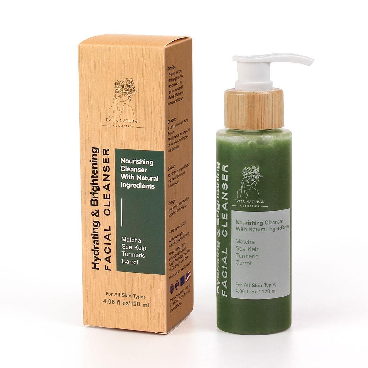 Evita Natural Cosmetics Hydrating & Revitalizing Facial Cleanser with Matcha & Sea Kelp Nourishing Face Wash for All Skin Types 4.06 fl oz