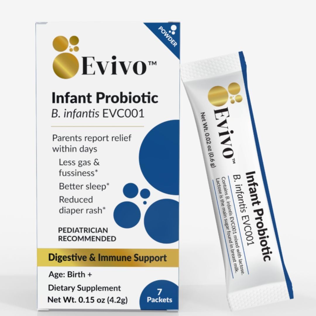 Designed for Health. Engineered for Quality.Ingredients:Purified lactose (milk),Bifidobacterium infantis EVC001 (soy†)CFU Count:8 Billion CFU per sachetNo additivesNo artificial colors or dyesNo artificial flavorsNo artificial preservativesGluten Free† Manufacturing process may lead to residual amounts of soy† Finely milled and mixed with lactose, the main sugar found naturally in breast milkBifidobacterium infantis is missing from 90% of babiesScience shows Bifidobacterium infantis belongs in the infant gut, but is missing from 90% of US babies due to high antibiotic usage and modernized feeding and birthing practices. Evivo Bifidobacterium infantis product restores good bacteria nature intended for a foundation of good health.Evivo is based on 20 years of research out of UC Davis into understanding the powerful partnership between the infant gut microbiome and breast milk components. Our team is dedicated to bringing this protective system back to babies.How does Evivo infant probiotic powder work?CaptureB. infantis EVC001 uniquely captures Human Milk Oligosaccharides (HMOs) found in breast milk, helping infants maximize nutrition from breast milk.ConsumeB. infantis EVC001 then consumes HMOs toreplicate, establish, and persist, in the gut to help reduce colic & digestive discomfort, protecting baby from the inside out.ConvertFinally, B. infantis EVC001 converts HMOs into key signaling molecules that help support a healthy gut & immune system. 4, 5, 6