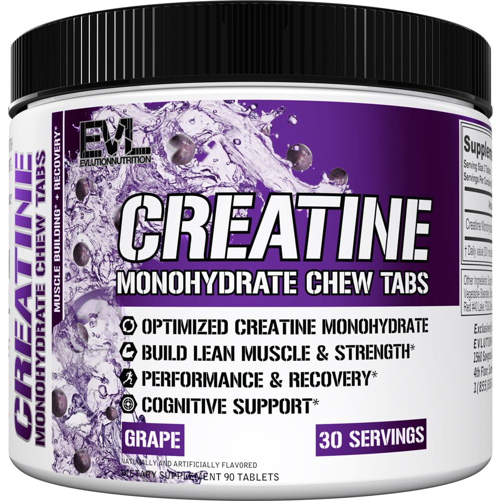 Evlution Nutrition Creatine Monohydrate Chew Tabs - Muscle Growth Strength Performance Recovery & Cognitive Support - 3000mg Creatine Monohydrate Per Serving - 30 Servings - 90 Tablets - Grape