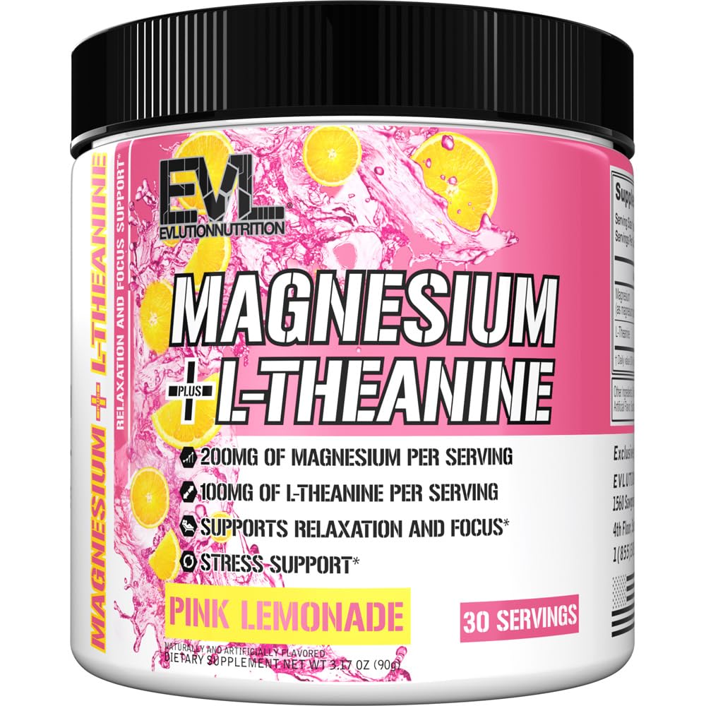 Evlution Nutrition Magnesium + L-Theanine - Natural Relaxation & Focus Support - 200mg Magnesium + 100mg L-Theanine - Vegan & Non-GMO - Powder Dietary Supplement - 30 Servings - Pink Lemonade