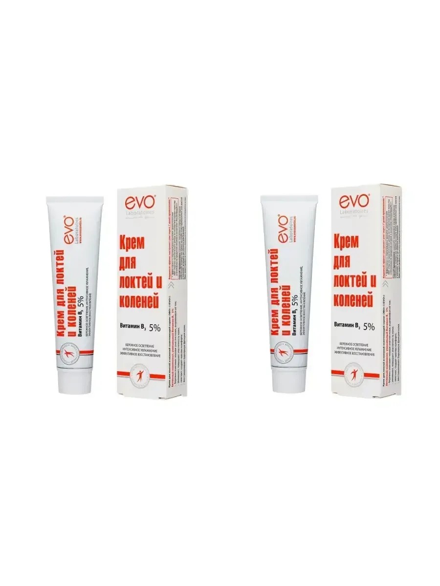 EVO 46мл для локтей и коленей, 2 шт - Крем для локтей и коленей EVO осветляющий. Кожа на локтях и коленях, особенно с возрастом, склонна к гиперкератозу (сухости, шелушению, огрубению), что приводит к ее гиперпигментации (локальному потемнению). Оптимальная концентрация Витамина В3 (5%) в составе продукта поможет оперативно восстановить здоровый цвет кожи и защитить её от негативного внешнего воздействия. Для усиления смягчающего свойства крема в состав введен карбамид (мочевина). Высокое содержание карбамида (10%) интенсивно смягчает и увлажняет сухую, огрубевшую и потрескавшуюся кожу, способствует ее обновлению. Уже через 7 дней регулярного применения кожа на локтях и коленях заметно улучшается, а через месяц полностью восстанавливается и радует вас здоровым внешним видом.