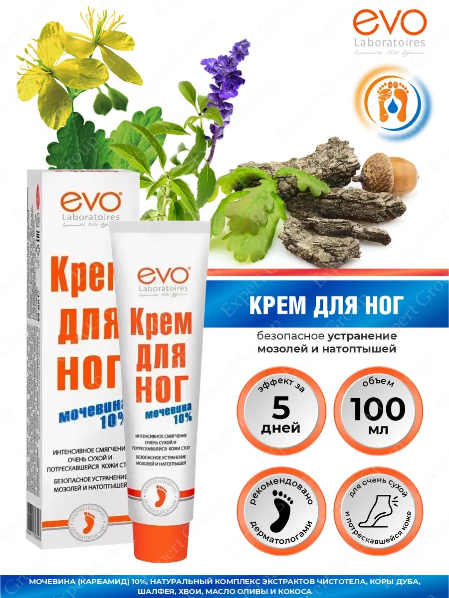 EVO Крем для ног с Мочевиной 100 мл. К покупке доступны на выбор 1 шт. или 2 шт. Сбалансированный уход. Мочевина (карбамид) 10% интенсивно смягчает сухую, огрубевшую и потрескавшуюся кожу стоп. Эффективно и безопасно устраняет сухие мозоли и натоптыши, улучшает обменные процессы кожи. Масло оливы и кокоса питают кожу, восстанавливают ее мягкость и эластичность, препятствуют потере влаги. Натуральный комплекс экстрактов чистотела, коры дуба, шалфея и хвои способствует устранению потертостей и раздражений, предотвращает развитие грибковой микрофлоры и неприятного запаха ног.
