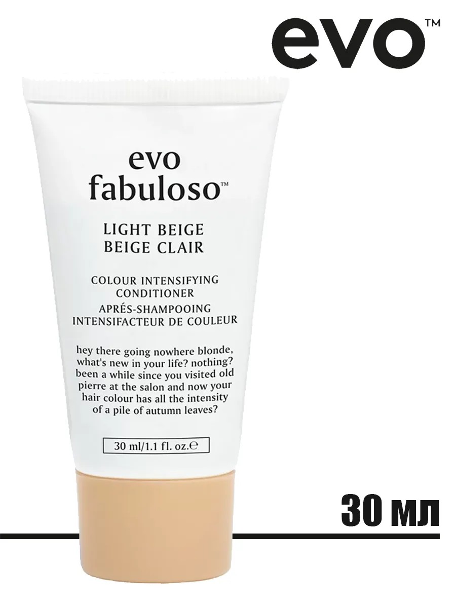 Color conditioner (strengthening agent), light beige for hair, Evo Fabuloso light beige color conditioner 30ml - 1 pc. Intensive color conditioner for hair; nourishes, refreshes color, adds shine to hair, tones in 3 minutes. For sparse, dry, color-treated light hair. BENEFITS: refreshes/tones color - intensively refreshes color and brings hair back to life; revitalization - nourishing ingredients soften and strengthen hair; shine - retains moisture, reduces frizz and gives bright shine. How to use: Wash hair and towel dry. Using gloves, apply the desired amount to hair. Distribute evenly with a comb or fingers. Leave on for 3 minutes. Rinse until the water becomes clear. Use once a week. Ingredients and benefits: cationic dye - tones; cetrimonium chloride - conditions, antistatic, reduces frizz; Panthenol – conditions and restores; benzophenone-4 – protects and preserves color. Vegan cosmetics / does not contain sulfates, parabens, DEA, TEA, propylene glycol, or preservatives / not tested on animals, does not harm the environment.
