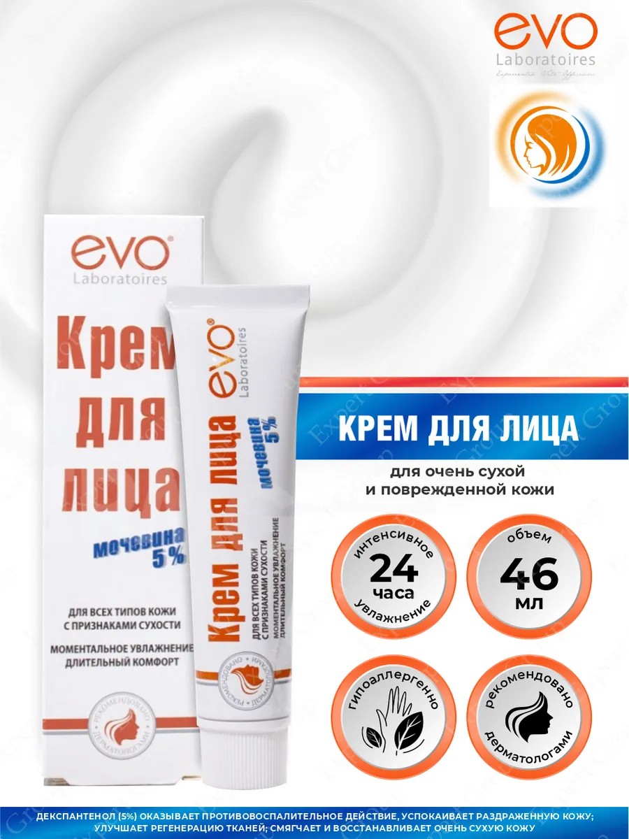 EVO Крем для лица с мочевиной для всех типов кожи с признаками сухости 46 мл. Крем для лица EVO с мочевиной 5% для всех типов кожи с признаками сухости моментально увлажняет сухую кожу лица, делает её мягкой и гладкой на долгое время. Оптимальное содержание мочевины, усиленное ниацинамидом (витамином В3): моментально и ощутимо увлажняет кожу, устраняет шелушение, стянутость и сухость кожи, восстанавливает эпидермальный барьер, обеспечивает гладкость, мягкость и упругость кожи. Смягчающий эффект сразу после нанесения крема. Увлажняющий эффект сразу после нанесения крема. Приятная бархатистость после нанесения крема. Кожа на длительное время остается более гладкой, эластичной и упругой. Подходит под макияж.
