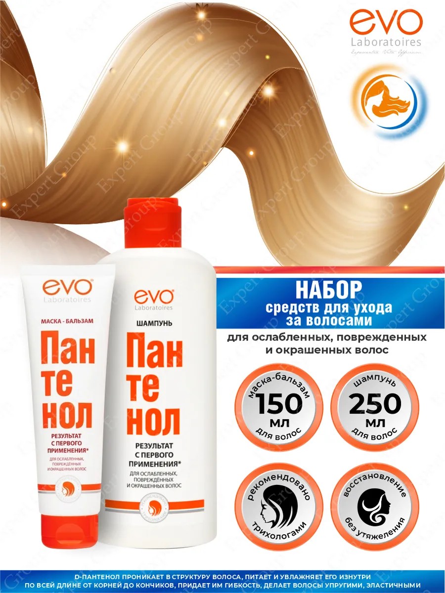 Набор EVO Маска-бальзам Пантенол для ослабленных волос 150 мл. + Шампунь для волос Пантенол 250 мл.Высокоэффективный продукт для восстановления и защиты поврежденных волос с 1-ого применения. Декспантенол увлажняет и питает волосы изнутри по всей длине от корней до кончиков. Придает им гибкость, делает волосы упругими и эластичными. Шампунь придает волосам блеск и объем без утяжеления благодаря инновационной кондиционирующей добавке на основе растительных масел. Уход за кожей головы осуществляется за счет комплекса Витаминов С и В3 (ниацинамид) с микроэлементами и пшеничными протеинами.Благодаря маске-бальзаму волосы не электризуются при высушивании феном и при расчесывании. Волосы блестящие, эластичные, выглядят здоровыми и ухоженными. Даже при ежедневной термоукладке феном, щипцами или плойкой волосы выглядят здоровыми. Эмульсия амодиметикона под действием нагревания выравнивает поверхность каждого волоса по всей длине, усиливает блеск и цвет окрашенных волос.