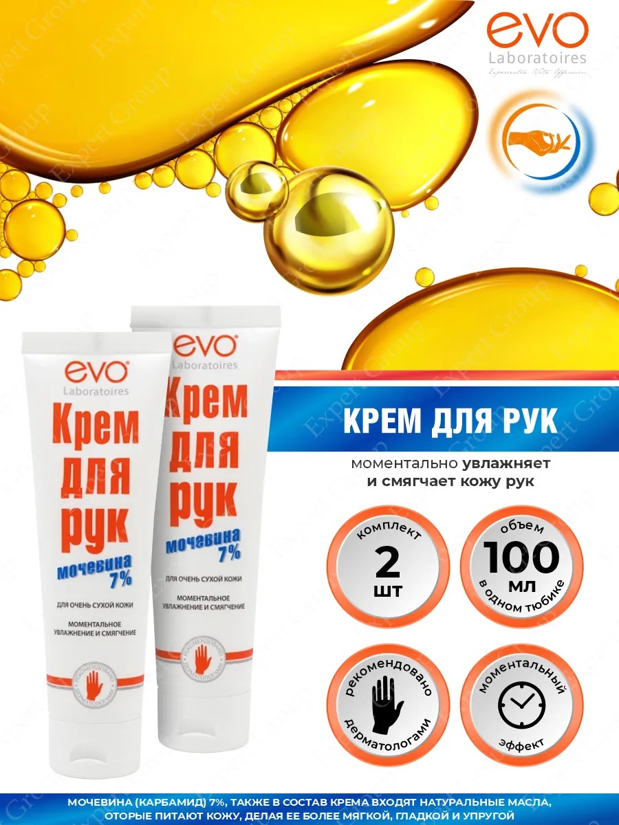 Комплект EVO Крем для рук с мочевиной 100 мл. х 2 шт. Моментальное увлажнение и смягчение. Различные признаки сухости кожи рук чаще всего проявляются в результате дефицита компонентов NMF (натурального увлажняющего фактора кожи). Специально подобранная комбинация этих компонентов - мочевины (карбамида) 7% и молочной кислоты 0,5% - обеспечивает высокую эффективность состава с первого нанесения. После использования крема EVO даже очень сухая кожа рук становится заметно более гладкой, эластичной и выглядит здоровой. Крем легко распределяется, быстро впитывается, не оставляет жирной пленки. Имеет легкий цветочный аромат. Рекомендован врачами-дерматологами для ежедневного ухода за сухой и шелушащейся кожей кистей рук.