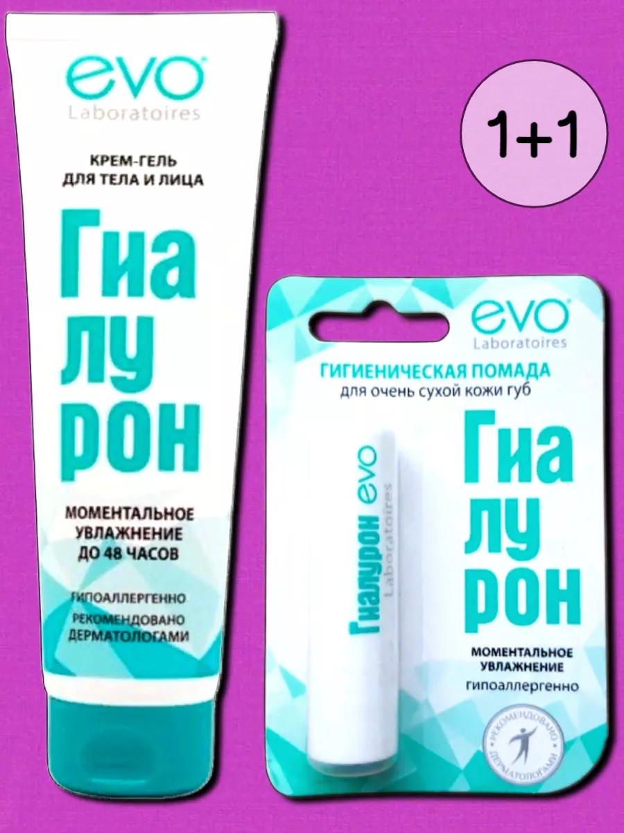 | Комплектация | ЭВО ГИАЛУРОН ПОМАДА ГИГИЕНИЧЕСКАЯ ДЛЯ ОЧЕНЬ СУХОЙ КОЖИ ГУБ 2,8*1шт; EVO КРЕМ-ГЕЛЬ ДЛЯ ТЕЛА И ЛИЦА ГИАЛУРОН 150МЛ*1шт |