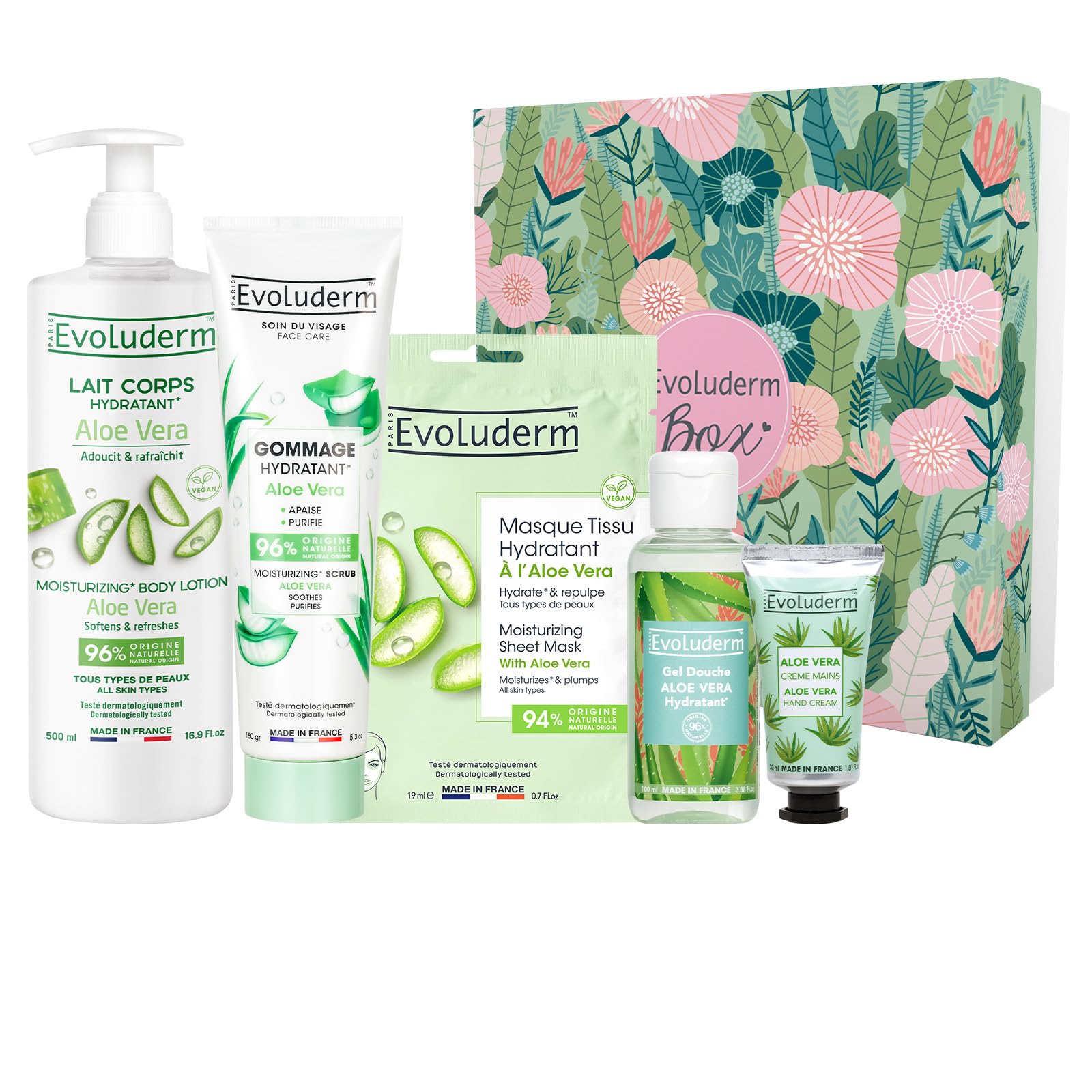 EVOLUDERM 100% Aloe Vera Gift Box 5 products + Shower Flower Natural Origin Vegan Made in France Jungle Box Gift Idea Ideal Christmas Birthday Mother s Day gift