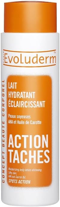 The Evoluderm anti-blemish moisturising and lightening lotion with carrot oil has been designed to effectively combat hyperpigmentation of black and mixed skin. Its formula, which is rich in AHA and carrot oil, gives your skin a silky feel and a luminous glow, while moisturising and nourishing it. Its daily use helps to reduce the appearance of blemishes and lighten dark areas. Leaves no greasy film. Works on the upper layers of the epidermis.