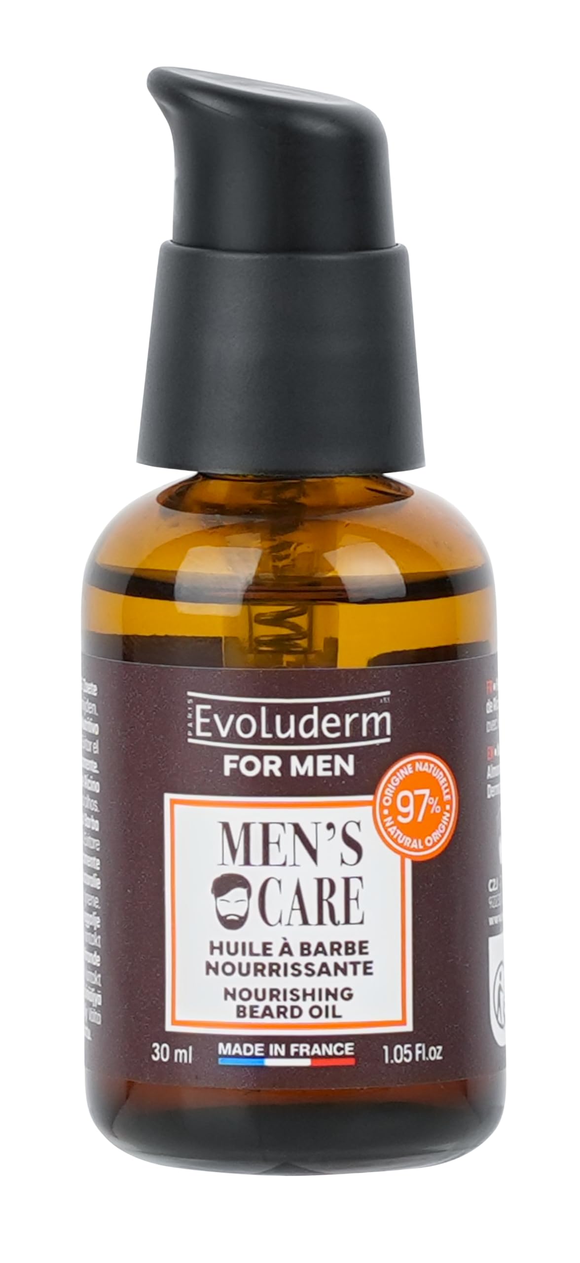 Enriched with Castor Oil and Sweet Almond Oil, this nourishing beard oil absorbs quickly, softens the beard, and adds shine. The result: a nourished, thickened, and manageable beard. SAFETY WARNING No warningsBENEFITS: Formulated with 97 Naturally Derived Ingredients, Vegan, Dermatologically Tested, Nourishes, Softens. MADE IN FRANCE: All Evoluderm products are entirely made in France and tested by independent laboratories. This ensures impeccable quality and respect for the environment. NOURISHES AND SOFTENS: This energizing moisturizing treatment soothes the skin and boosts its natural radiance. SWEET ALMOND OIL: Thanks to its softening properties, it protects the skin while relieving tightness. It repairs and nourishes beard hair. CASTOR OIL: Renowned for its repairing and nourishing properties, it strengthens, revitalizes, thickens, and regenerates beard hair.EVOLUDERM – Huile à Barbe Nourrissante Homme – 30 ml – 97 d'Origine Naturelle – Végan – Fabrication FrançaiseDESCRIPTION DU PRODUIT DESCRIPTION DU PRODUIT Enrichie en Huile de Ricin et en Huile d'Amande Douce, cette huile à barbe nourrissante pénètre rapidement, adoucit la barbe et lui apporte brillance. Résultat : la barbe est nourrie, épaissie et facile à coiffer. AVERTISSEMENT DE SÉCURITÉ RASBÉNÉFICES : Formulé à 97 d'Ingrédients d'Origine Naturelle, Végan, Testé Dermatologiquement, Nourrit, Adoucit. FABRICATION FRANÇAISE : L'ensemble des produits de la marque Evoluderm sont intégralement fabriqués en France et testés par des laboratoires indépendants. Cela permet de conserver une qualité irréprochable et respectueuse de l'environnement. NOURRIT ET ADOUCIT : Ce soin hydratant énergisant apaise la peau et booste son éclat naturel. HUILE D'AMANDE DOUCE : Grâce à ses propriétés adoucissantes, elle protège et la peau, tout en soulageant les sensations de tiraillement. Elle répare et nourrit les poils de la barbe. HUILE DE RICIN : Réputée pour ses vertus réparatrices et nourrissantes, elle renforce, revitalise, densifie et régénère les poils de la barbe.