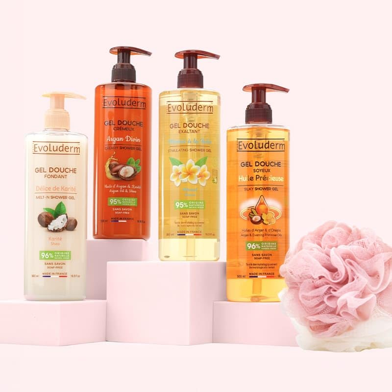 Evoluderm EVOLUDERM - Offer: 4 Shower Gels 500ml + Free Exfoliating Glove - Monoi Shower Gel - Argan - Shea Butter - Precious Oil - Natural Ingredients - Made in France