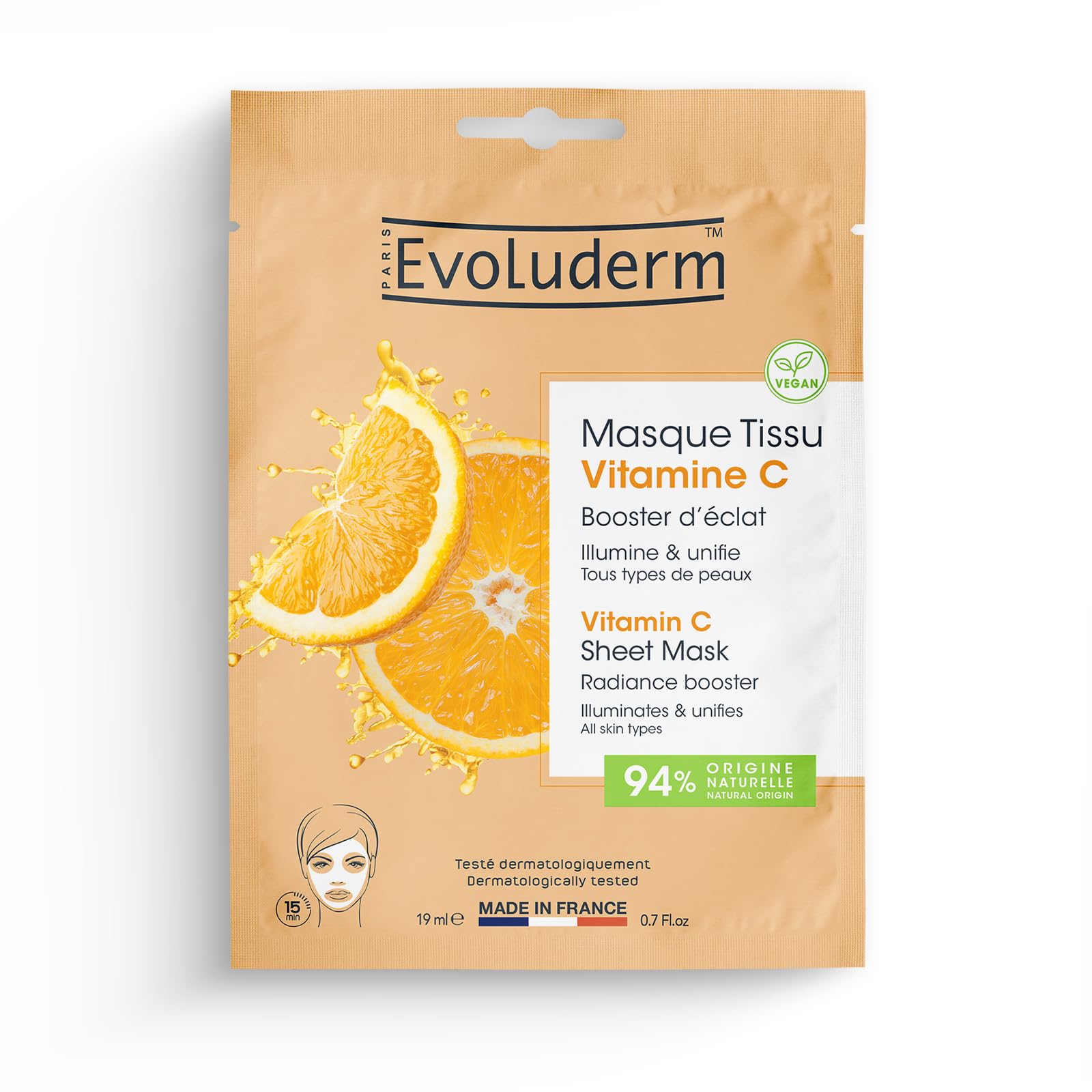 Enriched with Vitamin C, this sheet mask brightens and tones the face. A true ally for radiant and revitalized skin, Vitamin C is renowned for its antioxidant properties and its ability to boost the skin's natural radiance. INGREDIENTS WATER (AQUA), GLYCERIN, PENTYLENE GLYCOL, POLYSORBATE 20, XANTHAN GUM, TETRASODIUM GLUTAMATE DIACETATE, CITRIC ACID, ASCOPHYLLUM NODOSUM EXTRACT, CITRUS LIMON (LEMON) FRUIT EXTRACT, SODIUM ASCORBATE, SODIUM HYDROXIDE, POTASSIUM SORBATE, SODIUM BENZOATE. INSTRUCTIONS FOR USE What is the purpose of a face mask? Applying a mask helps to awaken and boost the skin's radiance for a bright and toned complexion. The fabric pad, infused with the serum, conforms to the contours of the face to perfectly distribute the active ingredients across the entire area. Leave it on for 15 minutes and remove it. Massage in, then absorb any excess serum with a cotton pad. See moreBENEFITS: Formula with 94 Naturally Derived Ingredients, Vegan, Dermatologically Tested, Hydrates, Illuminates, Tones. MADE IN FRANCE: All Evoluderm products are entirely made in France and tested by independent laboratories. This ensures impeccable quality and respect for the environment. RADIANCE: Thanks to our Vitamin C Sheet Mask, rediscover a fresh complexion and radiant skin in just a few steps. LYOCELL TECHNOLOGY: Thanks to this technology, the ultra-fine fibers of the fabric allow for optimal diffusion of the mask's active ingredients. VITAMIN C: Renowned for its antioxidant properties, Vitamin C reveals the skin's natural radiance. Vitamin C reduces signs of fatigue, tones, and illuminates the face.EVOLUDERM - Masque Tissu Vitamine C Booster d'Eclat - 94 d'Ingrédients d'Orgine Naturelle - 19ml - Frabircation FrançaiseDESCRIPTION DU PRODUIT DESCRIPTION DU PRODUIT Enrichi en Vitamine C, ce masque tissu illumine et tonifie le visage. Véritable alliée pour une peau éclatante et revitalisée, la Vitamine C est réputée pour ses propriétés antioxydantes et sa capacité à booster l'éclat naturel de la peau. INGRÉDIENTS WATER (AQUA), GLYCERIN, PENTYLENE GLYCOL, POLYSORBATE 20, XANTHAN GUM, TETRASODIUM GLUTAMATE DIACETATE, CITRIC ACID, ASCOPHYLLUM NODOSUM EXTRACT, CITRUS LIMON (LEMON) FRUIT EXTRACT, SODIUM ASCORBATE, SODIUM HYDROXIDE, POTASSIUM SORBATE, SODIUM BENZOATE. MODE D'EMPLOI À quoi sert un masque visage ? L'application d'un masque permet de réveiller et booster l'éclat de la peau pour un visage illuminé et tonifié. Le support en tissu imprégné de son sérum épouse les contours du visage pour diffuser parfaitement les actifs sur l'ensemble de la zone. Laissez poser 15 minutes et retirez-le. Massez, puis absorbez l'excédent de sérum à l'aide d'un coton. Voir plusBÉNÉFICES : Formule à 94 d'Ingrédients d'Origine Naturelle, Végan, Testé Dermatologiquement, Hydrate, Illumine, Tonifie. FABRICATION FRANÇAISE : L'ensemble des produits de la marque Evoluderm sont intégralement fabriqués en France et testés par des laboratoires indépendants. Cela permet de conserver une qualité irréprochable et respectueuse de l'environnement. ÉCLAT : Grâce à notre Masque Tissu Vitamine C, retrouvez un teint frais et une peau éclatante en seulement quelques gestes. TECHNOLOGIE LYOCELL : Grâce à cette technologie, les fibres ultra fines du tissu permettent une diffusion optimale des actifs du masque. VITAMINE C : Actif réputée pour ses propriétés antioxydantes, la Vitamine C révèle l'éclat naturel de la peau. La Vitamine C réduit les signes de fatigue, tonifie et illumine le visage.