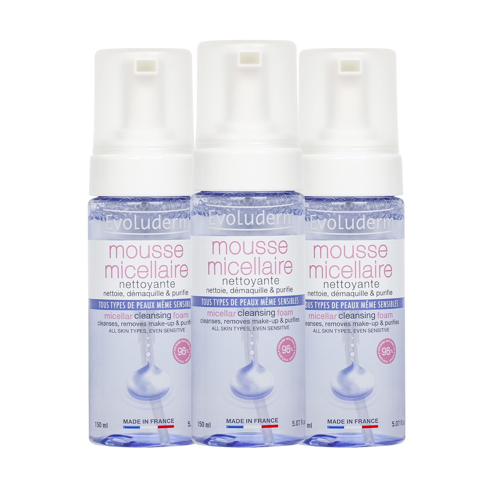 EVOLUDERM - Micellar Cleansing Foam - 150 ml - 97% Natural Origin - Vegan - Made in France - Pack of 3 x 150 ml