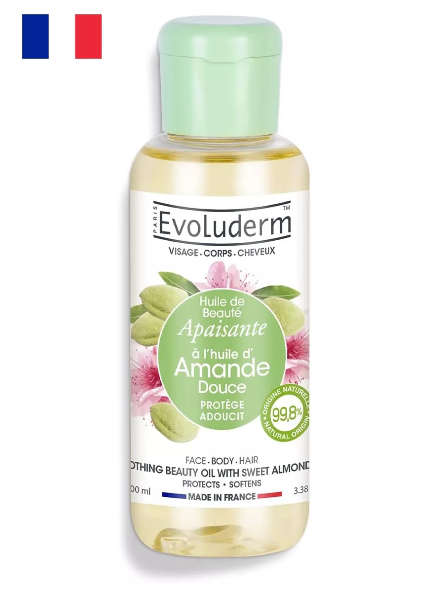 Evoluderm - это увлажняющее масло для лица, тела и волос с экстрактом миндаля, произведенное во Франции. Это успокаивающее средство, которое известно своими смягчающими свойствами и непревзойденной мягкостью. Составляющие этого масла на 99,8% натуральные ингредиенты, которые увлажняют кожу и восстанавливают ее эластичность. Это масло подходит для всех типов волос, осветляет и придает первоначальный блеск. Питательный и защитный, Evoluderm наполняет кожу и волосы тонким ароматом фруктовых нот. Это веганское масло, произведенное во Франции и дерматологически протестированное, гарантирует вам исключительное качество для улучшения состояния вашей кожи и волос. Успокаивающее косметическое масло с маслом сладкого миндаля, на 99,8% состоящее из натуральных ингредиентов, защищает и смягчает. Обогащенный витамином Е, он успокаивает кожу и устраняет чувство стянутости. Идеально подходит для восстановления и питания волос. Для лица и тела: аккуратно нанесите масло на кожу и массируйте легкими круговыми движениями. Для дополнительного ухода используйте его после скраба и наслаждайтесь его нежным ароматом. Для волос: нанесите несколько капель на влажные или сухие волосы, оставьте на 30 минут до 1 часа или на ночь, затем вымойте шампунем. Это французская уходовая косметика, идеальный подарок для женщин на день рождения и любой другой праздник. Evoluderm - ваш надежный помощник в уходе за кожей и волосами, подарите себе натуральную красоту и заботу из Франции.