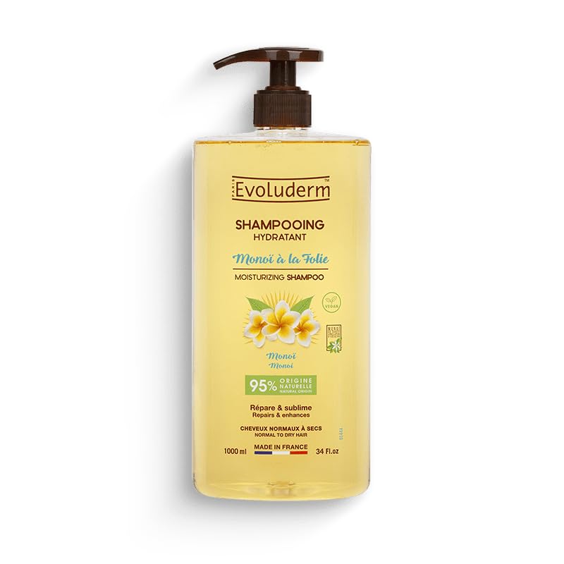 BENEFITS: Naturally sourced formula Vegan Dermatologically tested. MADE IN FRANCE: All Evoluderm brand products are entirely made in France and tested by independent laboratories. This ensures impeccable quality and respect for the environment. REPAIRS: Suitable for all hair types, this Shampoo repairs and coats the hair fiber. Softened, your hair detangles more easily and radiates beauty. SUBLIME: Monoï de Tahiti - Appellation of Origin - brings shine and luster to your hair to ensure resplendent hair. Soft tropical notes transport you on a sensory journey every day. HYDRATES: Tiare Flower combined with Coconut Oil combine their moisturizing and nourishing properties to guarantee supple and shiny hair every day. It regains beauty and strength.BÉNÉFICES : Formule d'origine naturelle Végane Testé dermatologiquement. FABRICATION FRANÇAISE : L'ensemble des produits de la marque Evoluderm sont intégralement fabriqués en France et testés par des laboratoires indépendants. Cela permet de conserver une qualité irréprochable et respectueuse de l'environnement. RÉPARE : Adapté à tous les types de cheveux, ce Shampoing répare et gaine la fibre capillaire. Adoucies, vos cheveux se démêlent plus facilement et rayonne de beauté. SUBLIME : Le Monoï de Tahiti - Appellation d'Origine - apporte éclat et brillance à vos cheveux pour assurer une chevelure resplendissante. De douces notes tropicales vous transportent au quotidien dans un voyage sensoriel. HYDRATE : La Fleur de Tiaré mariées à l'Huile de Coco mêlent leurs vertus hydratantes et nourrissantes pour garantir des cheveux souples et brillants au quotidien. Ils retrouvent beauté et force.