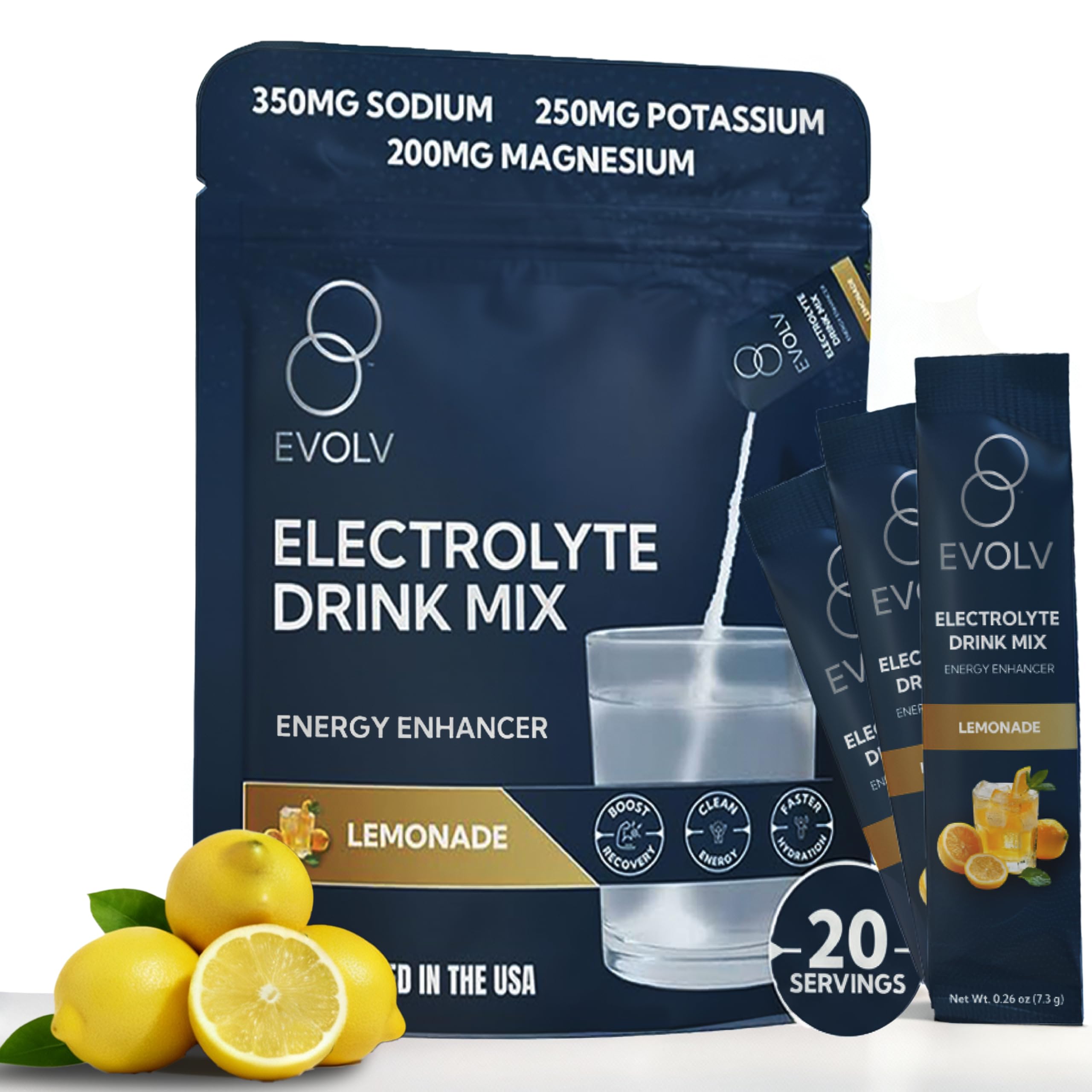 EVOLV Electrolytes Powder Packets Electrolyte Packets with Palatinose, Sodium & Minerals Instant Hydration Drink for Recovery, Non-GMO Hydration Sticks for On-The-Go Use (Pack of 20) - Lemonade