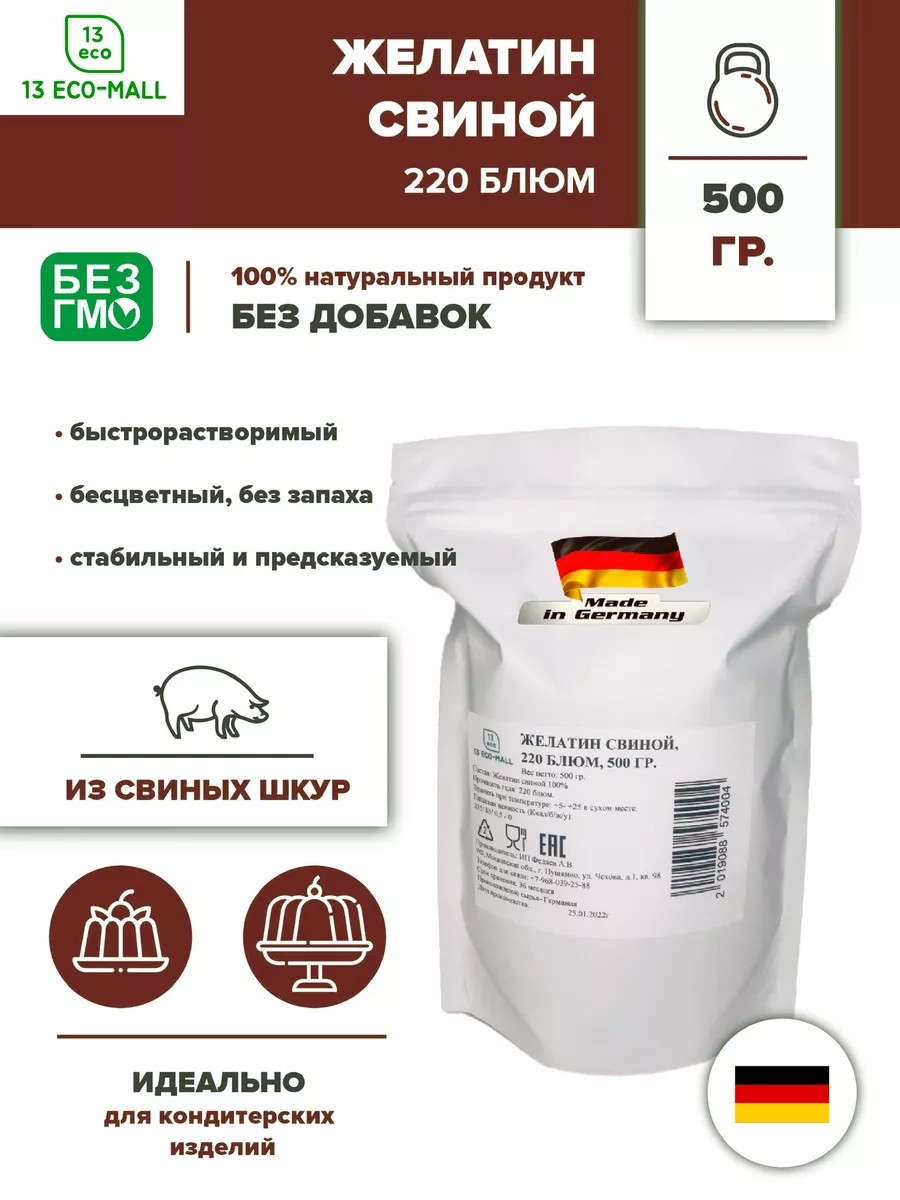 Желатин Свиной 220 Bloom/ Блюм , быстрорастворимый, натуральный свиной, пищевой, кондитерский. Желатин - смесь белков животного происхождения. Готовый желатин- сухой продукт без вкуса, запаха, прозрачный. Перед использованием желатин требуется замочить в холодной воде, чтобы избегать образования пузырьков при нагревании и твердых нерастворимых комков. После замачивания желатиновую смесь можно добавлять согласно рецептуре. Никогда не используйте при работе с желатином алюминиевую посуду. Не перегревайте желатино-содержащую массу больше 75- желатин потеряет свои свойства, блюдо будет испорченным.Ключевые слова: желатин, желе, мармелад, джем, правильное питание, пп. Правильное питание десерты, кулинария, зефир. Желатин для холодца является ключевым ингредиентом при приготовлении панакоты, пудинга и иных желейных блюд и десертов, придавая им нужную форму и консистенцию. Желатин кондитерский обладает множеством полезных свойств, которые могут благотворно повлиять на здоровье. Желатин говяжий для суставов содержит коллаген, который является строительным блоком суставов и связок. Также желатин говяжий натуральный может помочь укрепить волосы и улучшить их состояние. Желатин пищевой натуральный улучшает пищеварение, так как он содержит ферменты, которые помогают расщеплять пищу. Рекомендации по применению: 10 г желатина (1 столовая ложка) залить 100 мл холодной кипяченой воды, выдержать 20 -30 минут для набухания, добавить 200 мл горячей (80 - 90 С) жидкости (сироп, бульон, молоко и пр.), хорошо размешать до полного растворения, при необходимости процедить. Мы будем рады, если Вы расскажите свои впечатления о нашем свинном Желатине своим Друзьям.