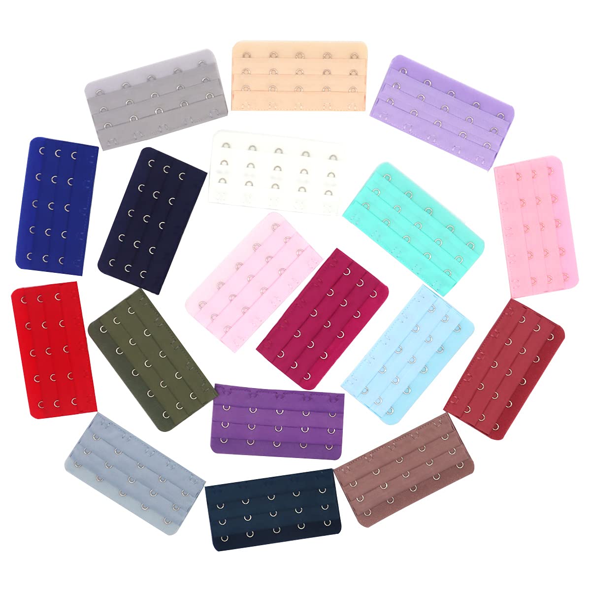 Fits various size bras with back hook clasps.Suitable for adjusting your new bra and old bra's size in case of weight gaining,pregnancy and underwear shrinks. Used to add more room and comfort while wearing your bra.These brassiere extension hooks can extend your double or triple hook bras easily,in case of weight gaining,good for pregnant moms and would help to fix your unfitted bras,etc. Assorted colors provide you more choices to match your brap,such as red,purple,beige,pink,black,blue,white,etc.are all beautiful colors,they are good for matching your existing bras of different colors.Please note:color will be sent in random. Hook and Eye closure.16 pcs extender included,each one has 3 5 hooks,which can match with most kinds of bras of different types and hooks. Material:these bra extensions made of soft and comfortable cotton material,with stainless steel steel hooks and eyes Easy to wash.Demensions(LxW):5cm 9.5cm 2.0" 3.7".