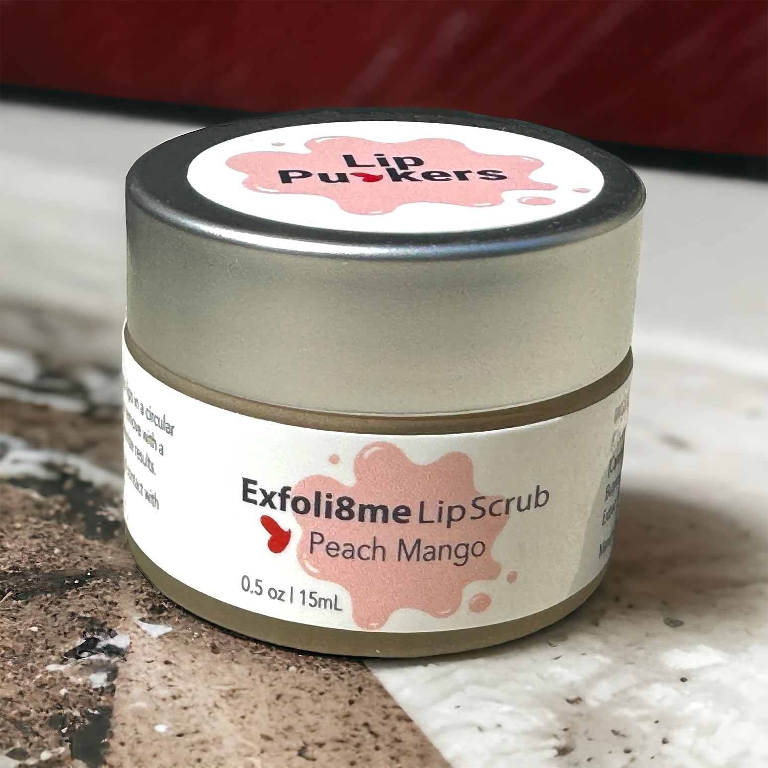 exfoli8me peach lip scrub jar with images of peaches, lip puckers name at the bottom