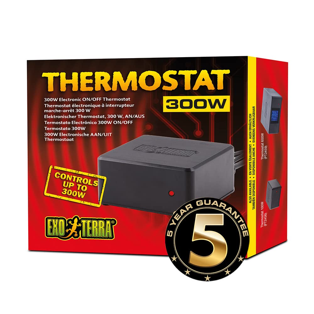 Precise control of the temperature in the terrarium Ideal for use with substrathic and heat cables The temperature between 20 ° C and 35 ° C waterproof television devices controls heating devices up to 100W/300W/600W reptiles are ectotherm and need the heat from an external source toTo be able to optimally regulate body temperature.Most reptiles use both the direct heat broadcast by the sun and the transmitted heat from surfaces that were heated by the sun, such as branches, rocks or other heat -storing structures.To produce such a species -appropriate temperature gradient in a terrarium is an important factor for successful reptile husbandry.With the electronic exo terra thermostat (AN/OFF, 100 W) you can create a well -controlled heat system.It enables you to maintain the required temperature conditions that resemble those in a desert or tropical environment.The thermostat also helps to avoid overheating on hot summer days or hypothermia in cold winter nights.The electronic triac switch keeps the temperature on the specified value and prevents temperature fluctuations in the terrarium.Connect your substrath ate, your heat cable or ceramic radiant heater to the EXO Terra thermostat, set the desired temperature and place the heat sensor at the desired place.The red LED heating indicator lights up when the heater heats up and turns out when the desired temperature has been reached.The embedded switch of the thermostat prevents accidental temperature changes if the device is touched.The thermostat is equipped with a 1.90 m long power cable and the waterproof television sensor can be easily used in very damp terrariums and water environments.The Exo Terra thermostat should be set according to the needs of the animals.Research the optimal temperature range (POTR - Preferred Optimum Temperature Range) so that you can create the right temperature gradient for the thermore regulation of your special reptiles in your terrarium.Can be used together with the following EXO Terra heat sources: Substrathic heating cable of ceramic heating spotlights Set contains: Thermostat controls heating devices up to 100W/300W/600W.Waterproof television.Check the temperature between 20 ° C and 35 ° C.Ideal for use with substrate and heat cables.Precise control of the temperature in the terrarium. Genaue Kontrolle der Temperatur im Terrarium Ideal für den Gebrauch mit Substratheizern und Wärmekabeln Kontrolliert die Temperatur zwischen 20°C und 35°C Wasserdichter Fernsensor Kontrolliert Heizgeräte bis zu 100W/300W/600W Reptilien sind ektotherm und brauchen die Wärme von einer externen Quelle, um ihre Körpertemperatur optimal regulieren zu können. Die meisten Reptilien verwenden sowohl die direkte von der Sonne ausgestrahlte Wärme als auch die übertragene Wärme von Oberflächen, die von der Sonne erwärmt wurden, wie beispielsweise Äste, Felsen oder andere wärmespeichernde Strukturen. Solch ein artgerechtes Temperaturgefälle in einem Terrarium herzustellen, ist ein wichtiger Faktor für die erfolgreiche Reptilienhaltung. Mit dem elektronischen Exo Terra Thermostat (AN/AUS, 100 W) können Sie ein gutgesteuertes Wärmesystem erzeugen. Es ermöglicht Ihnen, die benötigten Temperaturbedingungen beizubehalten, die denen in einer Wüsten- oder tropischen Umgebung ähneln. Der Thermostat trägt ebenfalls dazu bei, eine Überhitzung an heißen Sommertagen oder eine Unterkühlung in kalten Winternächten zu vermeiden. Der elektronische Triac-Schalter hält die Temperatur auf dem vorgegebenen Wert und verhindert Temperaturschwankungen im Terrarium. Verbinden Sie Ihren Substratheizer, Ihr Wärmekabel oder Ihren keramischen Heizstrahler mit dem Exo Terra Thermostat, stellen Sie die gewünschte Temperatur ein und platzieren Sie den Wärmesensor an der gewünschten Stelle. Der rote LED-Wärmeindikator leuchtet, wenn das Heizgerät heizt und stellt sich aus, wenn die gewünschte Temperatur erreicht wurde. Der eingelassene Schalter des Thermostaten verhindert versehentliche Temperaturänderungen, wenn das Gerät angefasst wird. Der Thermostat ist mit einem 1,90 m langen Netzkabel ausgerüstet und der wasserdichte Fernsensor kann problemlos in sehr feuchten Terrarien und Wasserumgebungen verwendet werden. Der Exo Terra Thermostat sollte den Bedürfnissen der Tiere gemäß eingestellt werden. Recherchieren Sie den optimalen Temperaturbereich (POTR - preferred optimum temperature range), so dass Sie das richtige Temperaturgefälle für die Thermoregulierung Ihrer speziellen Reptilien in Ihrem Terrarium schaffen können. Kann zusammen mit den folgenden Exo Terra Wärmequellen verwendet werden: Substratheizer Wärmekabel Keramischer Heizstrahler SET ENTHÄLT: ThermostatKontrolliert Heizgeräte bis zu 100W/300W/600W. Wasserdichter Fernsensor. Kontrolliert die Temperatur zwischen 20°C und 35°C. Ideal für den Gebrauch mit Substratheizern und Wärmekabeln. Genaue Kontrolle der Temperatur im Terrarium.Exo Terra Thermostat 300W, genaue Temperaturkontrolle im Terrarium, ideal für den Gebrauch mit Substratheizern, Wärmekabeln und keramischen Heizstrahlern 300 W