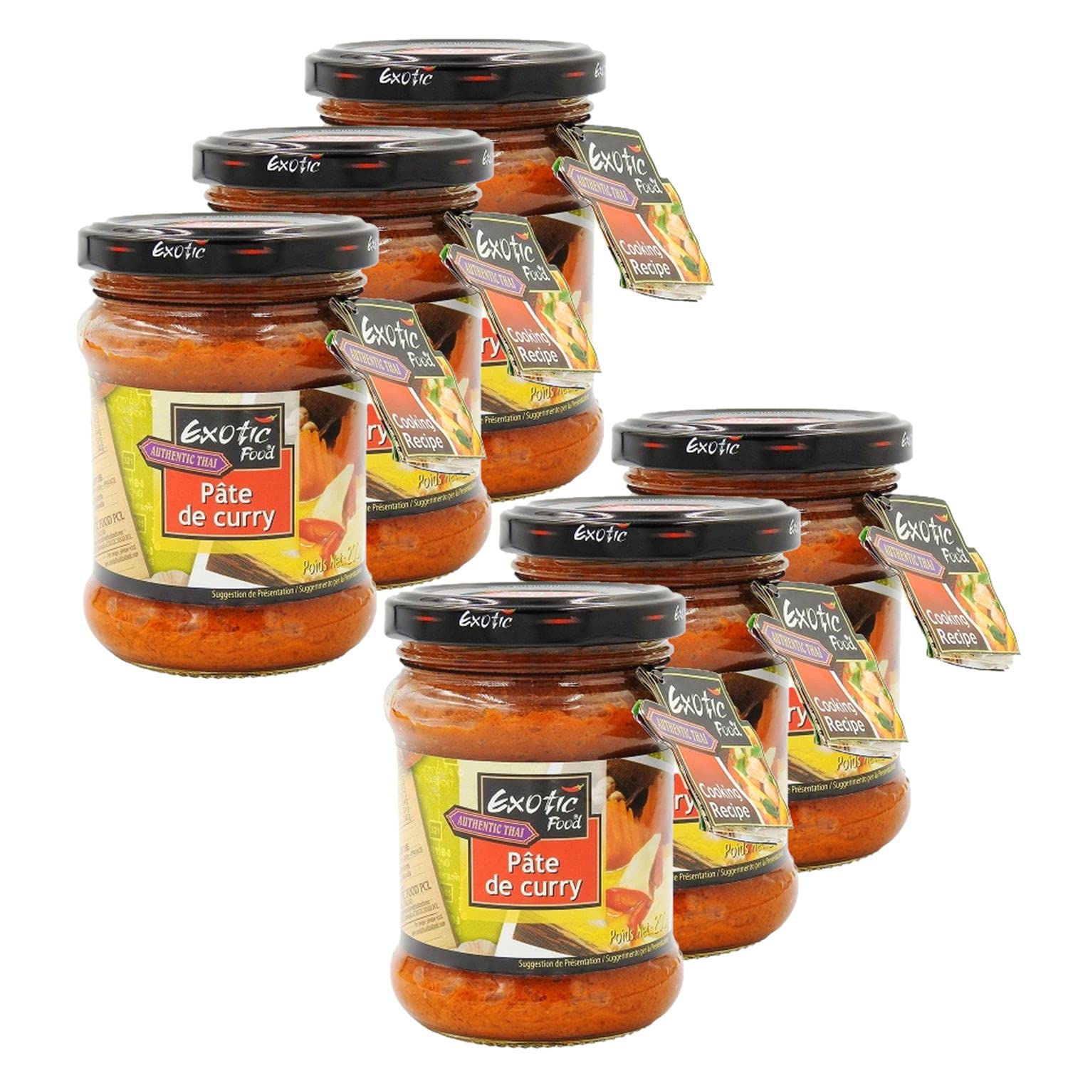 This pack contains 6 products as described below: Yellow curry paste made with chili, soy, and other spices will add flavor to your stews. Ingredients: Soybean oil, lemon, salt, chili, shallots, sugar, turmeric, garlic, curry powder 3.5 . Allergens: Soy Storage Instructions: Store at room temperature, away from heat and humidity, before opening. Usage Instructions: Dilute in a liquid, such as coconut milk, and use as a cooking broth for beef or chicken. Product Information: Net Weight: 200g Origin: Thailand Nutritional values per 100g: Energy: 887kJ 212kcal Fat: 17g, of which saturates 3g Carbohydrate: 8.7g, of which sugars 8.4g Protein: 3.1g Dietary Fiber: 0g Salt: 7.4g Packaging: Glass Jar Full details are available on the product packaging. The information on this page is for guidance only. Please refer to the product label for information regarding food allergies. SAFETY WARNING Full details are available on the product packaging. The information on this page is for guidance only. Please refer to the product label for information regarding food allergies.Lot 6x Pâte de curry jaune - Pot 200gDESCRIPTION DU PRODUIT DESCRIPTION DU PRODUIT Ce lot contient 6 produits décrits ci-dessous : Pâte de curry jaune à à base de piment, soja et autres épices donnera du goût à vos plats mijotés. Ingrédients : Huile de soja, citron, sel, piment, échalotes, sucre, curcuma, ail, poudre de curry 3,5 . Allergènes : Soja Mode de conservation : A conserver à température ambiante, à l'abri de la chaleur et de l'humidité avant ouverture. Conseil d'utilisation : A delayer dans un liquide, par exemple le lait de coco, et utiliser comme bouillon de cuisson pour du boeuf ou du poulet. Informations produit : Poids net : 200g Origine : Thaïlande Valeurs nutritionnelles pour 100g : Energie : 887KJ 212Kcal Lipides : 17g dont acides gras saturés 3g Glucides : 8,7g dont sucres 8,4g Protéines : 3,1g Fibres alimentaires : 0g Sel : 7,4g Emballage : Pot en Verre Détail complet et disponible sur l'emballage du produit. Les informations présentes sur cette page sont à titre indicatif. Nous vous invitons à prendre connaissance des informations sur l'étiquette du produit, en particulier concernant les allergies alimentaires. AVERTISSEMENT DE SÉCURITÉ Détail complet et disponible sur l'emballage du produit. Les informations présentes sur cette page sont à titre indicatif. Nous vous invitons à prendre connaissance des informations sur l'étiquette du produit, en particulier concernant les allergies alimentaires.