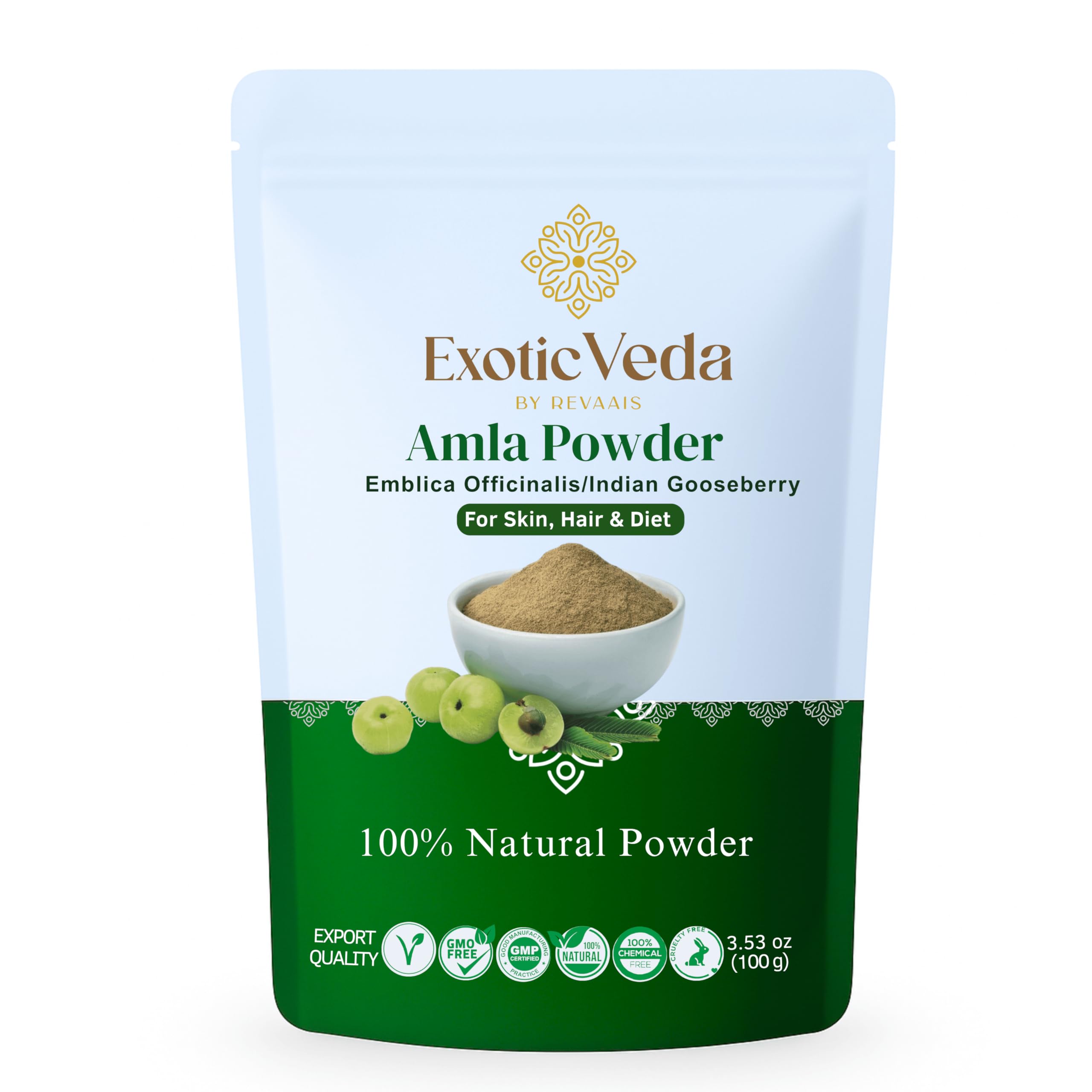PREMIUM QUALITY WITH RESEALABLE POUCH - At Exotic Veda, quality and authenticity are our priority. Our Amla Powder is finely ground, 100 pure, and packaged in a premium resealable 100g pouch to preserve freshness, potency, and aroma. Compact, travel-friendly, and easy to store, this pouch ensures long-lasting use. Free from artificial colors, preservatives, additives, or GMOs, Exotic Veda Amla Powder brings you a trustworthy, natural supplement inspired by Ayurvedic tradition and made for modern lifestyles. DIGESTIVE IMMUNE WELLNESS - Exotic Veda Amla Powder is naturally high in Vitamin C, which is known to support daily vitality and immune health. Traditionally, Amla has also been valued for helping to maintain digestive comfort and overall balance. Our powder can be easily added to juices, teas, or smoothies, offering a convenient way to support everyday wellness. With its pure and natural composition, it is an ideal addition to holistic living and those seeking gentle, plant-based nourishment. NATURAL SKIN VITALITY GLOW - Amla's antioxidant-rich profile makes it highly regarded in traditional beauty practices. Exotic Veda Amla Powder may be used as a natural face mask ingredient to refresh dull skin, minimize the appearance of blemishes, and encourage a radiant glow. When included in the diet, it helps support skin health naturally, offering a gentle yet effective way to maintain youthful and healthy-looking skin. A trusted herbal choice for beauty care that is pure, safe, and easy to use. TRADITIONAL HAIR CARE SUPPORT - Known for centuries in traditional Ayurvedic routines, Amla is regarded as a natural hair-friendly fruit. Exotic Veda Amla Powder can be mixed with water, oils, or other herbs to prepare nourishing hair masks that support scalp health, promote natural strength, and leave hair feeling soft and refreshed. With its fine texture, it blends smoothly, making it a safe and natural choice for those who prefer herbal care over chemical-based products in their hair routine. 100 PURE NATURAL AMLA POWDER - Exotic Veda Amla Powder is made from carefully dried Indian Gooseberries (Phyllanthus emblica), a fruit long valued in Ayurveda for its rejuvenating qualities. Rich in Vitamin C and natural antioxidants, our finely ground powder is completely free from preservatives, fillers, additives, and GMOs. Versatile and easy to use, it can be consumed in smoothies, teas, or juices, or applied in DIY hair and skincare routines. A natural way to enjoy authentic wellness in everyday life.