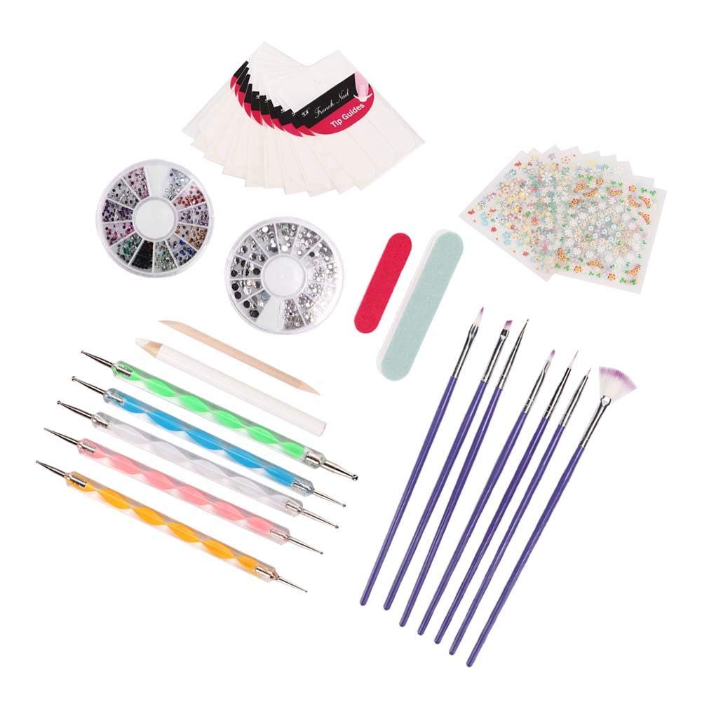Feature: 1. Nail art brush, soft nylon hair, delicate and flexible, exquisite workmanship. 2. Nail dotting pen is designed for nail art dotting and painting, practical for use. 3. 2 box of rhinestones, can decorate your nail, make nails exquisite and fashionable. 4. Nail file and polishing block can polish nail surface and trim nail edge, keep nails clean and tidy. 5. A set of nail art tools are available for use, meet your different needs. Specification: Condition: 100 Brand New Item Type: Nail Art Tool Set Material: ABS, Acrylic Suitable for: Home nail salon, etc Package List: 1 x Stick 1 x Nail File 1 x Polishing Block 1 x Rhinestones Suction Pencil 10 x Unique Nail Patch 1 x Box of Colour Rhinestones 1 x Box of AB Rhinestones 5 x Nail Dotting Pen 7 x Nail Art Brush 10 x Three-dimensional Nail Sticker INGREDIENTS default2 box of rhinestones, can decorate your nail, make nails exquisite and fashionable. Nail art brush, soft nylon hair, delicate and flexible, exquisite workmanship. Nail dotting pen is designed for nail art dotting and painting, practical for use. Nail file and polishing block can polish nail surface and trim nail edge, keep nails clean and tidy. A set of nail art tools are available for use, meet your different needs.