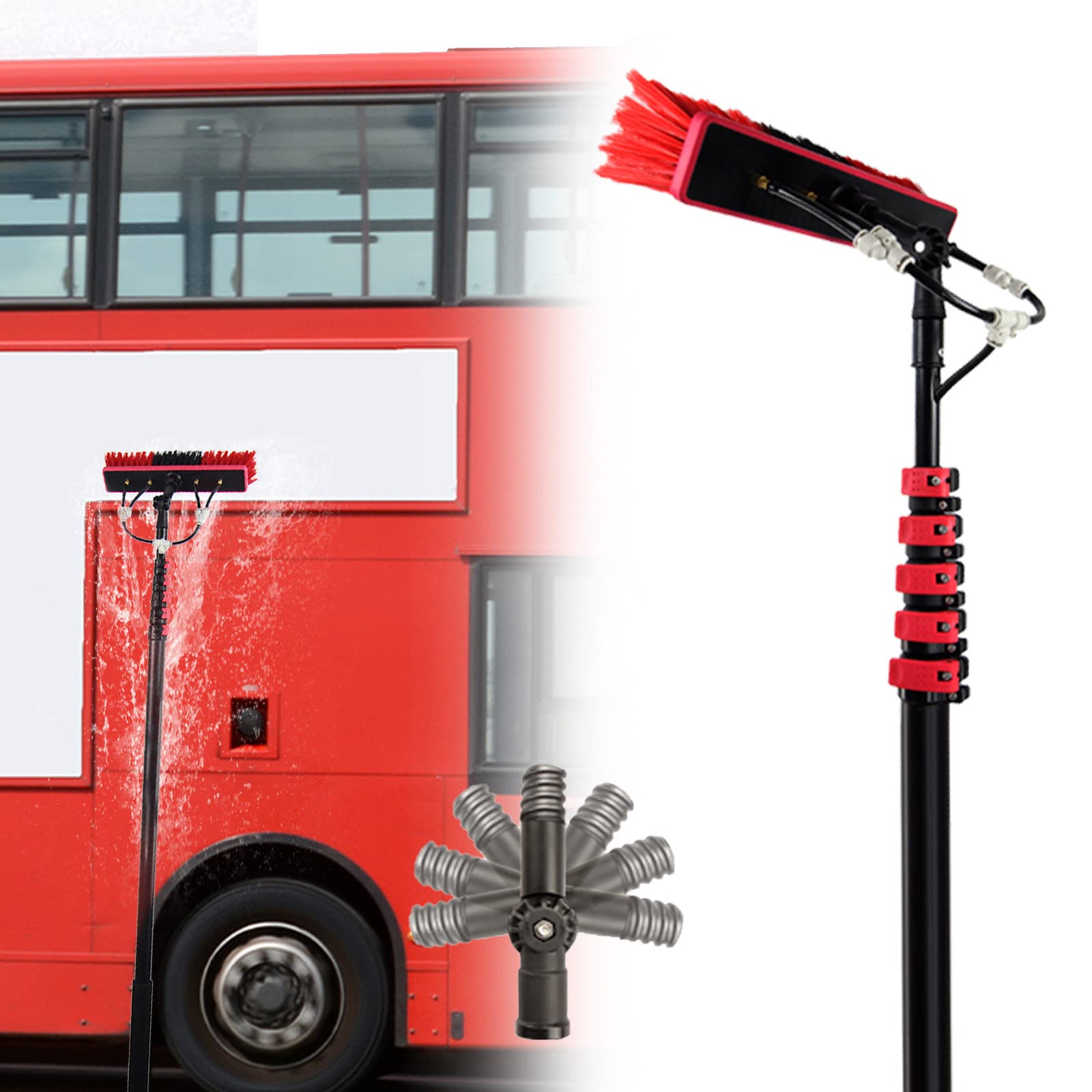 With this window cleaning brush, you can access windows from the ground faster and safer than ever before. --- USE RANGE: window cleaning, photovoltaic panel cleaning, bus/external cleaning, large vehicles, trucks, caravans, boats, etc. --- FEATURE: - Using high-density reinforced aluminum alloy, high hardness, not easy to rust, light weight. It will not bend even if it is 10 meters long. - Fixed by steel buckle, easy to remove. - Break-proof joint design, can be used with a variety of cleaning tools to complete advanced cleaning operations. PACKING LIST: Telescopicpole*1 Brushhead*1 Angeladapter*1 10cmwaterpipe*6 EN-copperquickconnect*1 Plasticquickconnect*1 Faucetquickconnect*1 12M waterpipe*1 8M waterpipe*1 Hosefittings*4 M4Screwdriver*1PORTABLE WATER SUPPLY - Can easily connect to your home faucet/garden hose (hose quick coupler, not included), allowing you to wash whenever you want. ADJUSTABLE BRUSH HEAD - A soft sponge covered handle holds the brush head and angled extension securely to the panel or glass for easy angle adjustment. Allows you to easily deal with dust and smudges in every corner. PREMIUM DESIGN AND MATERIALS - Multiple rods can be connected freely without bending. The steel buckle is fixed, perfectly closed, easy to install and easy to disassemble. High-density reinforced aluminum alloy, high hardness, not easy to rust, light weight. Very durable and soft feather bristles ensure a safe and clean surface. WIDE USE - Ideal for cleaning overhead windows, cleaning photovoltaic solar panels, cleaning shop signs, door headers, billboards, cleaning cars, trucks, vans, caravans, greenhouses, boats, decks and more.