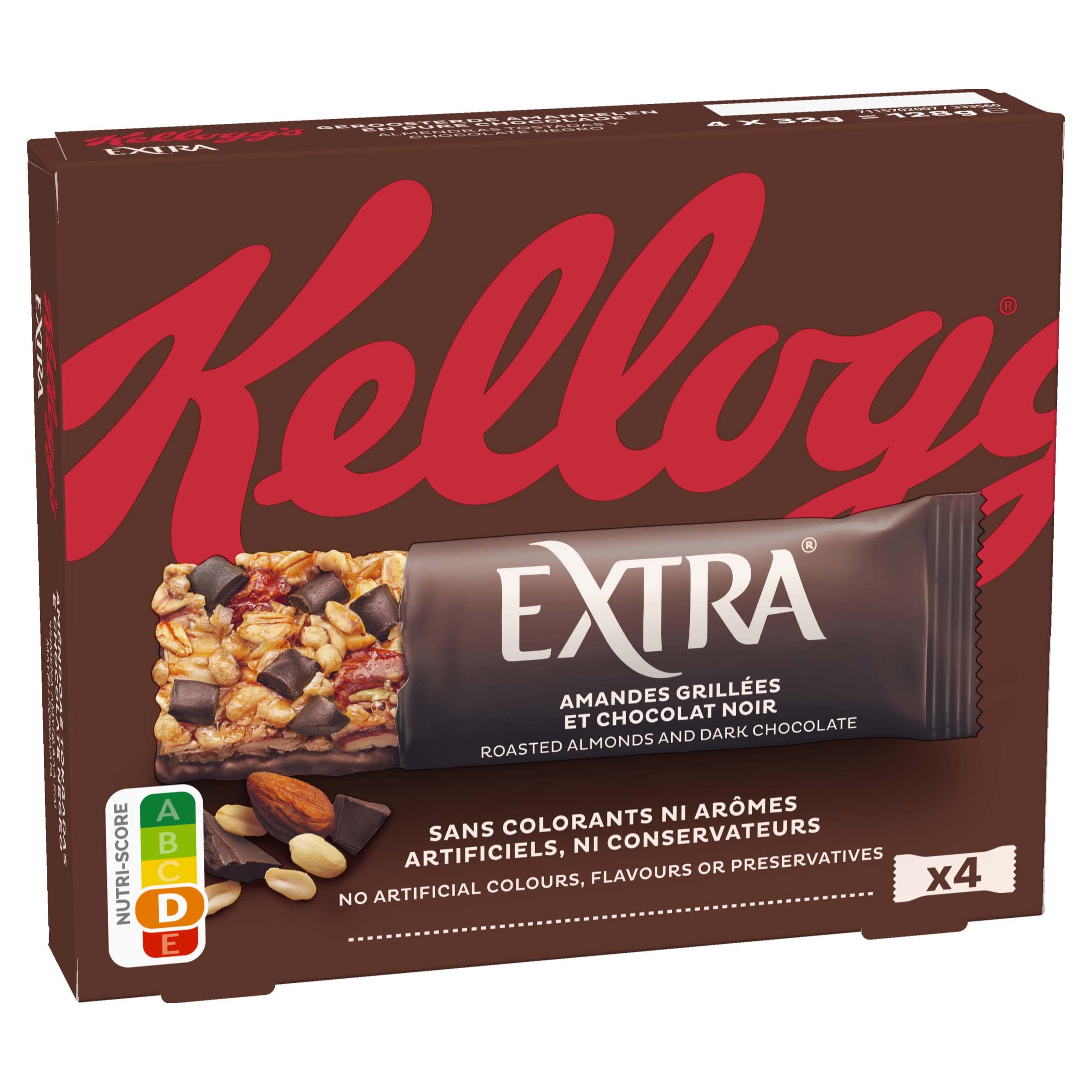 Extra generous Kellogg's cereal bars with toasted almonds and chocolate! Enjoy extra pleasure during your breaks with the extra generous bars! INGREDIENTS NUTS (41 ) (PEANUTS, roasted ALMONDS {Vegetable oil [Canola, Safflower] in varying proportions, Salt}), Chocolate (16 ) (Sugar, Cocoa paste, Cocoa butter, Low-fat cocoa powder, Emulsifier {SOYA lecithin}, Natural vanilla flavor), Glucose syrup, OATS (6.5 ), Chocolate pieces (5 ) (Cocoa paste, Sugar, Low-fat cocoa powder, Dextrose, Cocoa butter, Emulsifier {SOYA lecithin}), Fructose, Sugar, Crispy rice pieces (Rice flour, Rice bran, Sugar, Rice extract), Dried coconut, Dextrose, Palm oil, Humectants (Glycerol, Sorbitol), Molasses, Salt, Flavor, HAZELNUTS, NUTS CASHEW, sweetened condensed skimmed MILK (skimmed MILK, Sugar), Emulsifier (SOY Lecithin), Antioxidant (Rosemary extract). DIRECTIONS FOR USE Ready to enjoy SAFETY WARNING None DISCLAIMER Non-contractual photography. The above indications are given for information purposes. They are not necessarily exhaustive and cannot replace the information appearing on the product packaging which alone is authentic, and to which you are invited to refer, particularly in the event of food intolerance. Source of fiber. Enjoy as a mid-morning snack, a lunchtime treat, or on-the-go anytime of day. Recipe for the whole family. Contains program bars. A delicious blend of peanuts, almonds, and oats covered in chocolate. Barres de céréales généreuses extra Kellogg 's aux amandes grillées et chocolat ! Profitez du plaisir extra lors de vos pauses avec les barres extra généreuses !. INGRÉDIENTS NOIX(41 )(CACAHUÈTES, AMANDES grillées{Huile végétale[Canola, Carthame] en proportions variables, Sel}), Chocolat (16 )(Sucre, Pâte de cacao, Beurre de cacao, Cacao maigre en poudre, Emulsifiant {Lécithine de SOJA}, Arôme naturel de vanille), Sirop de glucose, AVOINE(6.5 ), Morceaux de chocolat (5 )(Pâte de cacao, Sucre, Cacao maigre en poudre, Dextrose, Beurre de cacao, Emulsifiant{Lécithine de SOJA}), Fructose, Sucre, Morceaux de riz croustillants(Farine de riz, Son de riz, Sucre, Extrait de riz), Noix de coco séchée, Dextrose, Huile de palme, Humectants(Glycérol, Sorbitol), Mélasse, Sel, Arôme, NOISETTES, NOIX DE CAJOU, LAIT écrémé concentré sucré (LAIT écrémé, Sucre), Émulsifiant(Lécithine de SOJA), Antioxydant(Extrait de romarin). MODE D'EMPLOI Prêt à déguster AVERTISSEMENT DE SÛRETÉ Aucun CLAUSE DE NON-GARANTIE Photographie non contractuelle. Les indications ci-dessus sont données à titre d'information. Elles ne sont pas forcément exhaustives et ne sauraient se substituer aux informations figurant sur l'emballage du produit qui font seules foi, et auxquelles vous êtes invités à vous reporter, notamment en cas d'intolérance alimentaire. Source de fibres. À savourer comme un en-cas en milieu de matinée, une friandise au déjeuner ou sur le pouce à tout moment de la journée. Recette pour toute la famille. Contient barres de programmes. Un savoureux mélange de cacahuètes, d'amandes et d'avoine nappé de chocolat.