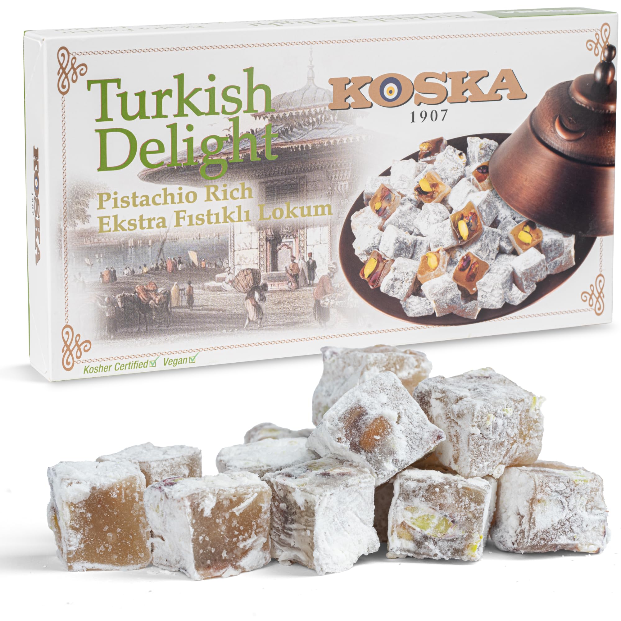 Ingredients: Sugar, pistachio, corn starch, water, acidifier (citric acid) Average nutritional values per 100 g Energy 1720Kj 407 Kcal, Fat 7.3 g of which saturates 1.1 g, Carbohydrates 80.7 g of which sugars 75 g, Fiber 2.2 g, Protein 3.6 g, Salt 0 g. INGREDIENTS sugar, corn starch, pistachios, water, acidifier (citric acid)100 SATISFACTION GUARANTEE: At Dorimed, we take the origin of our natural products very seriously, which is why we offer you products that meet the highest quality standards. In addition, you can count on a MONEY-BACK GUARANTEE (no questions asked) and COMPETITIVE DELIVERY. VEGAN-HALAL-KOSHER: KOSKA has received the BCR certificate, the Kosher certificate (the quality certificate given by the United States of America indicating that no animal products are used and that precise hygienic production is respected), the quality certificate of the British Vegetarian Association, and finally the Halal certificate (the certificate indicating that the product is suitable for Islamic dietary laws that control food preparation). IDEAL GIFT FOR SPECIAL DAYS: Excellent gift for any occasion. Surprise your loved ones with this delicious Turkish Delight box. The package contains bite-sized pieces of Turkish delight coated with icing sugar (to prevent them from sticking together), along with nutritional information and a list of ingredients. Ideal for a birthday, Christmas, Valentine's Day, Mother's Day, Father's Day, Easter, Eid, Ramadan, or other holiday gifts. THE TASTE OF A CENTURY: The famous KOSKA tradition dates back to the confectionery factory in Denizli opened by Haci Emin Bey in 1907. Under the management of the founding family for four generations, Koska has proudly used the same original recipe for one hundred years. Koska is one of the few companies that manages to be a brand of the century by building a bridge between the past and the future. GOURMET TURKISH DELIGHT WITH PISTACHIO FLAVOR: An assortment of delicious Turkish Delight with pistachio flavor, a sweet, chewy, and very fresh treat from Turkey. Turkish Delight is a traditional treat enjoyed with a cup of coffee or tea. Ingrédients : Sucre, pistache, amidon de maïs, eau, acidifiant (acide citrique) Valeurs nutritionnelles moyenne pour 100 g Energie 1720Kj 407 Kcal , Matières grasses 7,3 g dont saturées 1,1 g, Glucides 80,7 g dont sucres 75 g, Fibres 2,2 g ,Protéines 3,6 g, Sel 0 g. INGRÉDIENTS sucre,amidon de mais,Pistaches,eau,acidifiant (acide citrique)GARANTIE DE SATISFACTION À 100 : Chez Dorimed, nous prenons très au sérieux l'origine de nos produits naturels, c'est pourquoi nous vous proposons des produits conformes aux normes de qualité les plus élevées. De plus, vous pouvez compter sur une GARANTIE DE REMBOURSEMENT (aucune question posée) et un LIVRAISON COMPÉTITIVE. VEGAN-HALAL-KOSHER : KOSKA a reçu le certificat BCR, le certificat Kosher (le certificat de qualité donné par les États-Unis d'Amérique indiquant qu'aucun produit animal n'est utilisé et qu'une production hygiénique précise est respectée), le certificat de qualité de la British Vegetarian Association, et enfin le certificat Halal (le certificat indiquant que le produit est adapté aux lois diététiques islamiques qui contrôlent la préparation des aliments). CADEAU IDÉAL POUR LES JOURNÉES SPÉCIALES : Excellent cadeau pour toute occasion. Surprenez vos proches avec cette délicieuse boîte de Loukoums, L'emballage contient des bouchées de délices turcs coupées et enrobées de sucre glacé (pour éviter qu'elles ne collent entre elles), ainsi que des informations sur la nutrition et la liste des ingrédients. Idéal pour un cadeau d'anniversaire, Noël, Saint-Valentin, fête des mères, de fête des pères, Pâques, l'Aid, Ramadhan, un cadeau d'autres fête. LE GOÛT D'UN SIÈCLE : La célèbre tradition de la KOSKA remonte à la confiserie de Denizli ouverte par Haci Emin Bey en 1907. Sous la direction de la famille fondatrice depuis quatre générations, Koska utilise fièrement la même recette originale depuis cent ans. Koska est l'une des rares entreprises qui réussit à être une marque du siècle en construisant un pont entre le passé et le futur. DÉLICE TURC GOURMET AU GOÛT DE PISTACHE : Assortiment de délicieux Loukoums au goût de pistache, une friandise qui est douce, moelleuse et très fraîche en provenance de Turquie. Le Turkish Delight est une friandises traditionnelles accompagnées d'une tasse de café ou de Thé.