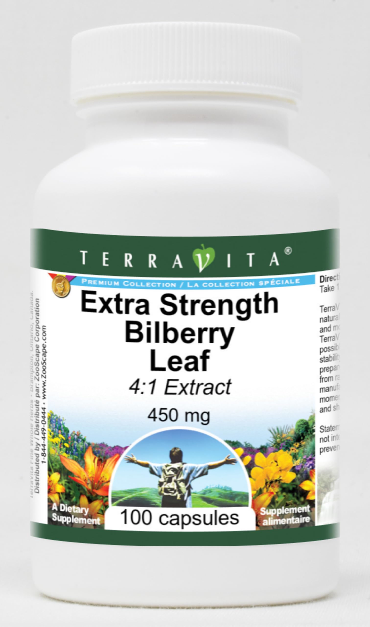 Extra Strength Bilberry Leaf 4:1 Extract - 450 mg (100 capsules, ZIN: 511245) Packaged in the United States in a GMP certified facility (Good Manufacturing Practice). No fillers. Manufacturer: TerraVita Size: 100 capsules Easy-to-swallow Capsules in a sealed bottle. Ingredients: Gelatin, Water, Bilberry Leaf - 1800 mg (Standardized Extract 4:1)