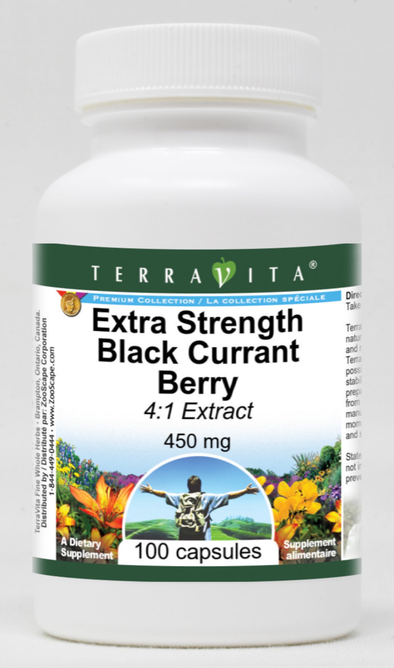 Extra Strength Black Currant Berry 4:1 Extract - 450 mg (100 capsules, ZIN: 514114) Packaged in the United States in a GMP certified facility (Good Manufacturing Practice). No fillers. Manufacturer: TerraVita Size: 100 capsules Easy-to-swallow Capsules in a sealed bottle. Ingredients: Gelatin, Water, Black Currant Berry 4:1 Extract - 450 mg